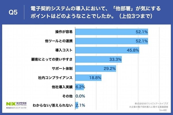 Q4で「かなりある」「ややある」と回答した方に、「Q5.電子契約システムの導入において、「他部署」が気にするポイントはどのようなことでしたか。(上位3つまで)」(n=48)と質問したところ、「操作が容易」が52.1%、「他ツールとの連携」が52.1%、「導入コスト」が45.8%という回答となりました。