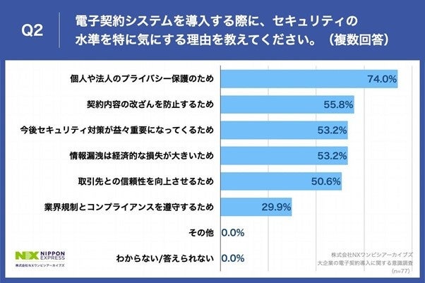 Q1で「セキュリティの水準」と回答した方に、「Q2.電子契約システムを導入する際に、セキュリティの水準を特に気にする理由を教えてください。(複数回答)」(n=77)と質問したところ、「個人や法人のプライバシー保護のため」が74.0%、「契約内容の改ざんを防止するため」が55.8%、「今後セキュリティ対策が益々重要になってくるため」が53.2%、「情報漏洩は経済的な損失が大きいため」が53.2%という回答となりました。