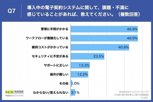Q6で「10割(非常に満足している)」「わからない/答えられない」以外を回答した方に、「Q7.導入中の電子契約システムに関して、課題・不満に感じていることがあれば、教えてください。(複数回答)」(n=98)と質問したところ、「管理に手間がかかる」が46.9%、「ワークフローが複雑化している」が46.9%、「維持コストがかかっている」が40.8%という回答となりました。