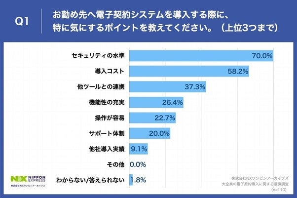 「Q1.お勤め先へ電子契約システムを導入する際に、特に気にするポイントを教えてください。(上位3つまで)」(n=110)と質問したところ、「セキュリティの水準」が70.0%、「導入コスト」が58.2%、「他ツールとの連携」が37.3%という回答となりました。