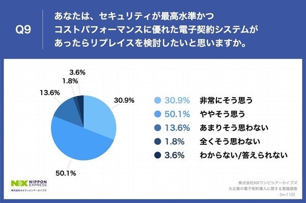 「Q9.あなたは、セキュリティが最高水準かつコストパフォーマンスに優れた電子契約システムがあったらリプレイスを検討したいと思いますか。」(n=110)と質問したところ、「非常にそう思う」が30.9%、「ややそう思う」が50.1%という回答となりました。
