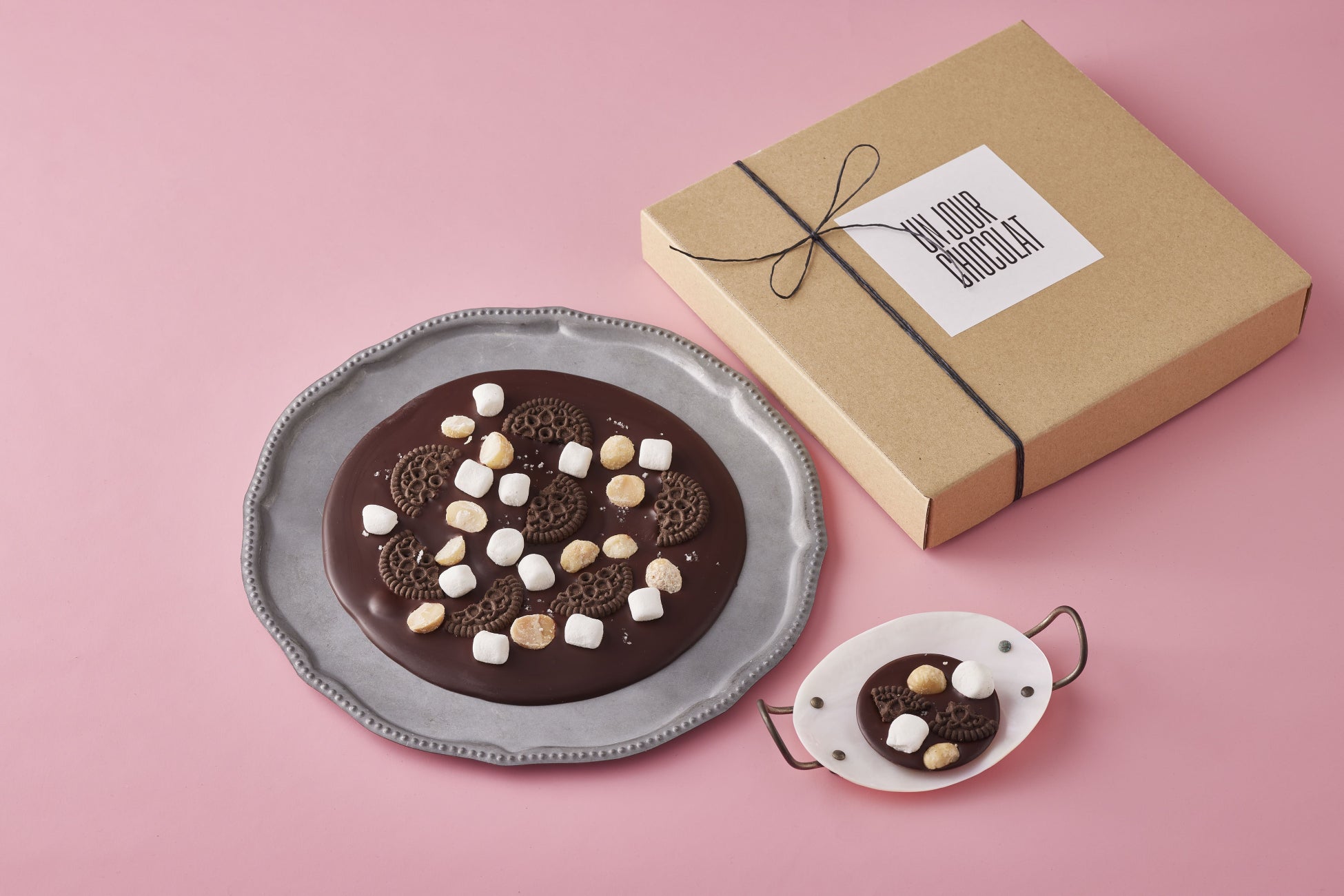 ビターチョコレートにクッキーやマシュマロ、マカダミアナッツをちりばめた、バレンタインらしく見た目の華やかなラウンドショコラ。アクセントのソルトがチョコレートの風味を一層引き立てます。直径約20cmの「大」は箱入り、直径6cmの「小」は個包装で用意しています。
