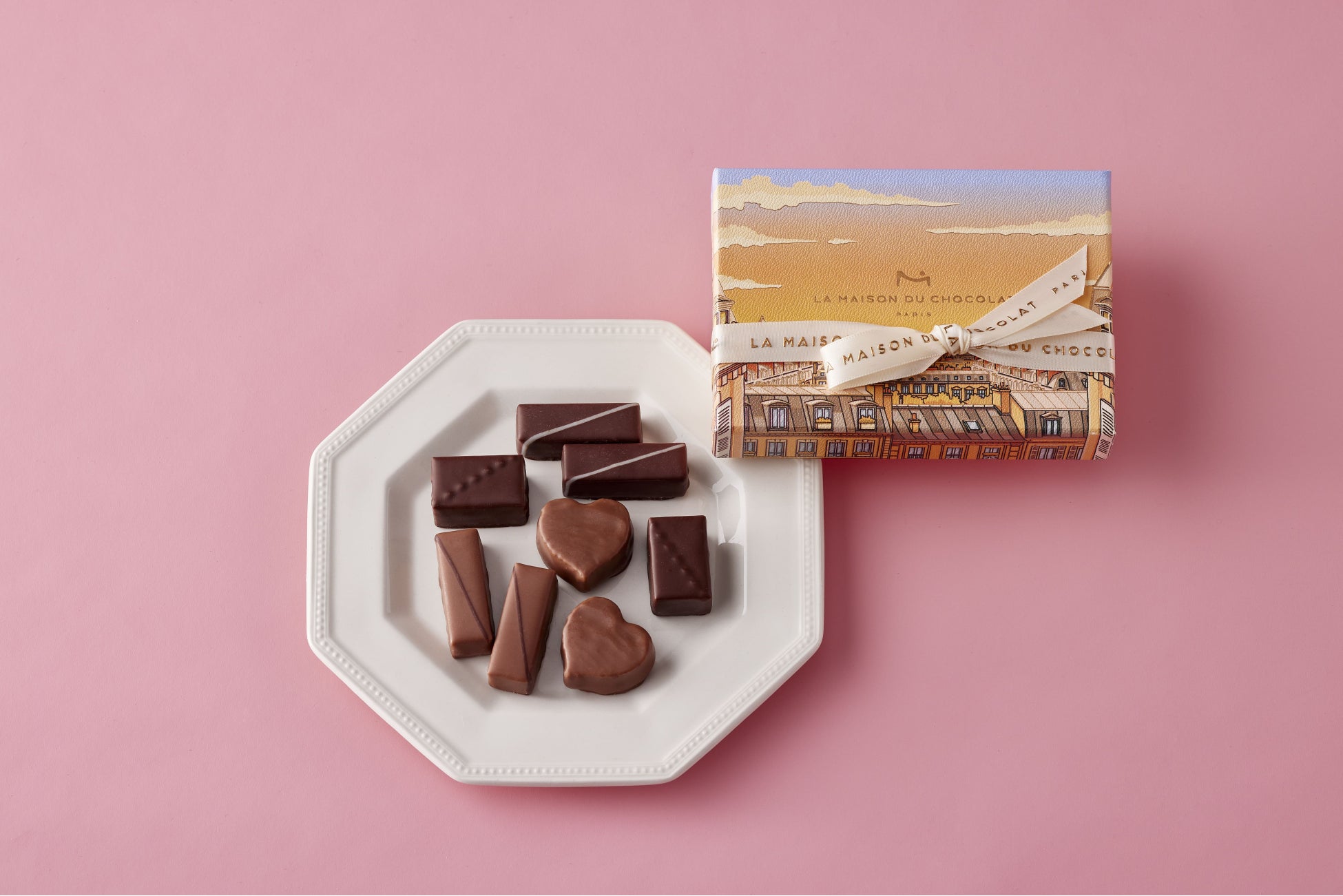 夕日に染まるパリの街並みを描いたボックスが美しいバレンタインコレクション。ダークとミルクのチョコレートをブレンドしたプレーンなガナッシュ、パリで採取された蜂蜜の香りが華やかなダークガナッシュなど、4種の限定ボンボンドゥショコラの詰め合わせです。