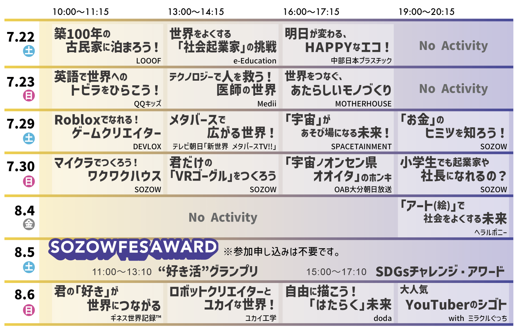 参加申込締め切り :各アクティビティの終了予定時間まで