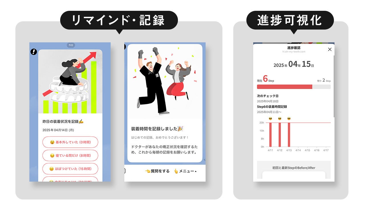 Oh my teethは次の3つの機能によってユーザーのモチベーションを維持し、矯正完走までサポートします。
