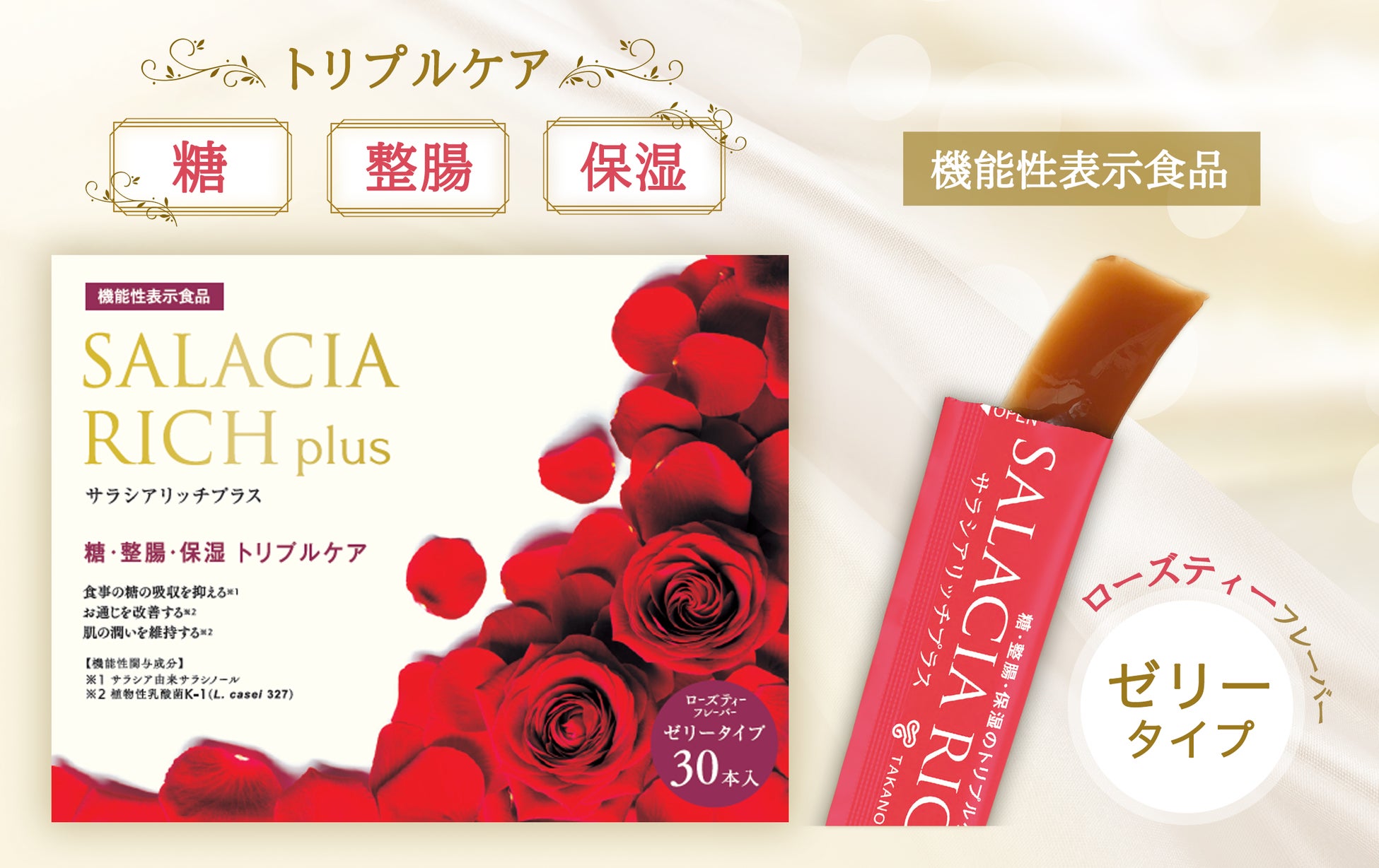 サラシア由来サラシノールと植物性乳酸菌K-1(L. casei 327)を配合することにより、「食事から摂取した糖の吸収を抑え、食後血糖値の上昇をゆるやかにする機能」「おなかの調子を整えお通じを改善する機能」「肌の潤いを維持する機能」の3つの機能性を備え、女性が抱えがちな悩み「糖・整腸・保湿」に訴求しています。