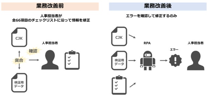 2019年の米中貿易摩擦や中国経済の減速を契機に、同社は市場環境の変化に左右されづらい企業体制の構築を目指し、生産設備の稼働率向上や組織体制のスリム化等の6つの分野において、業務フローや組織構造を根本的に改善するBPRの推進に取り組んできました。しかし、人事・労務領域においては、法や労務知識を要する業務の専門性の高さからBPRの推進が難航していました。そこで、約1,200法人グループが導入している統合人事システム「COMPANY」を展開する人事・労務業務の総合ソリューション企業であるWHIとコンサルティング契約を締結し、すでに同社で導入していた「COMPANY」をさらに活用すると共に、ワークフローの自動化や業務プロセスの改善においてはパーソルプロセス&テクノロジー株式会社の協力も得ながら人事管理・給与計算などのデータ処理にRPAを導入したことで、年間約2,300時間分の人事業務を削減することに成功いたしました。