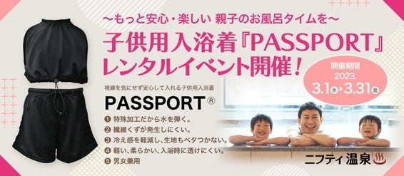 期間中は、ニフティ温泉が紹介する人気温浴施設5施設を利用するお子様や親子連れの方に向けて、子供用入浴着として開発された専用衣料『PASSPORT』を無償で貸し出し、また、施設内でレンタル体験していただくことで、温浴レジャーをより楽しんでいただくための新たなツール発展に向けた検証を実施いたします。