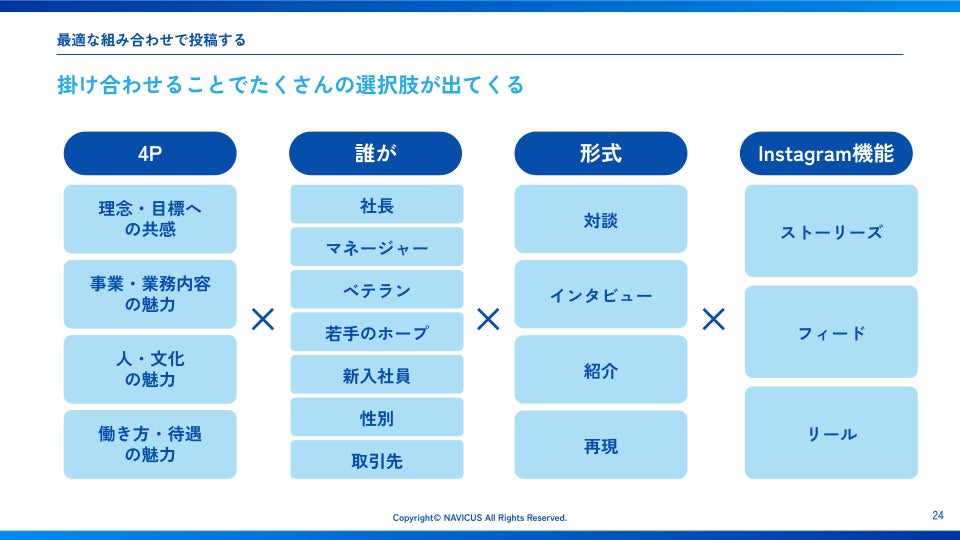また、NAVICUSでは4Pをベースにした独自の魅力診断からInstagram運用・効果測定などプロのノウハウをパッケージ化した「Instagram採用支援サービス」もご提供しております。