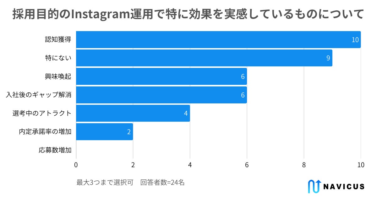 次に、「採用目的のInstagram運用で特に効果を実感しているもの」を同様の選択肢で聞いたところ、10票(41.7%)の「認知獲得」に次いで「特にない」が9票(37.5%)で多くなっていました。採用目的のInstagram運用に取り組む担当者の40%近い人が、特に明確な効果を実感できていない状態で運用をしている現状が明らかになっています。