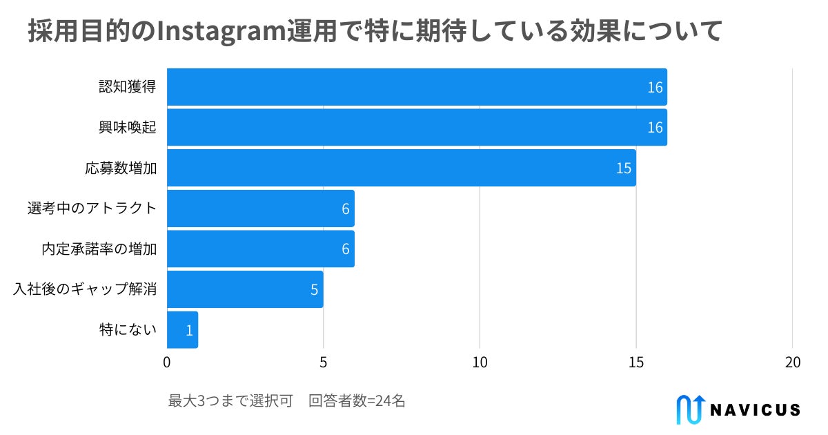 実施後のアンケートに回答した35名のうち、実際に採用目的のInstagram運用に取り組んでいる人は24名でした。その24名に「採用目的のInstagram運用で特に期待している効果」を最大3つの複数選択で聞いたところ、「認知獲得」「興味喚起」が16票(66.7%)で並び最も多くなりました。