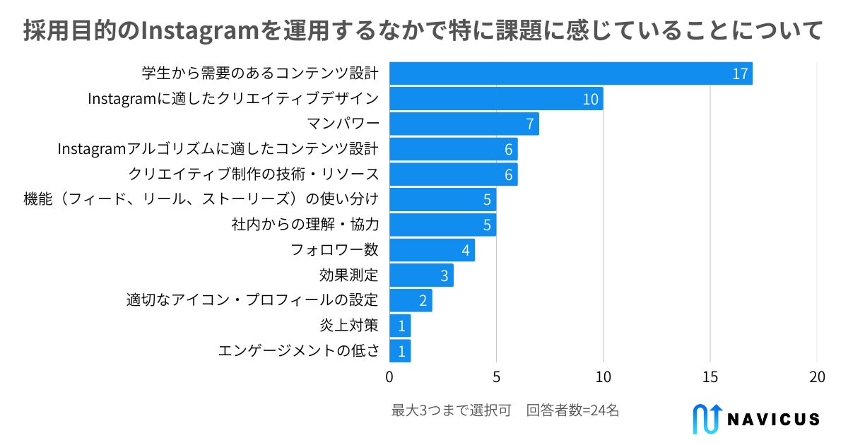また、「採用目的のInstagramを運用するなかで特に課題に感じていること」を最大3つの複数選択で聞いたところ、「学生から需要のあるコンテンツ設計」が17票(70.8%)で最も多くなりました。