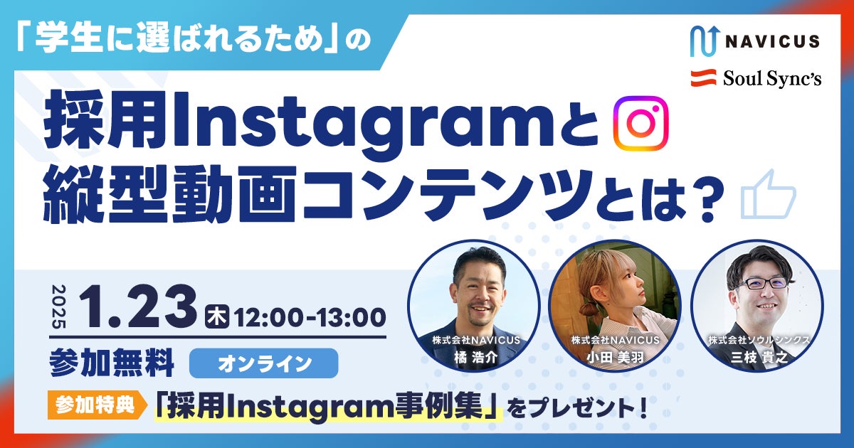SNSを通じて企業様や地方自治体様のコミュニケーション支援サービスを提供する株式会社NAVICUS(本社:東京都千代田区、代表取締役:武内 一矢、以下:NAVICUS)は、2025年1月23日(木)に、株式会社ソウルシンクス(本社:千葉県千葉市美浜区、代表取締役:菊地 雅克、以下:ソウルシンクス)と無料ウェビナー『「学生に選ばれるための」採用Instagramと縦型動画コンテンツとは?』を実施いたしました。
