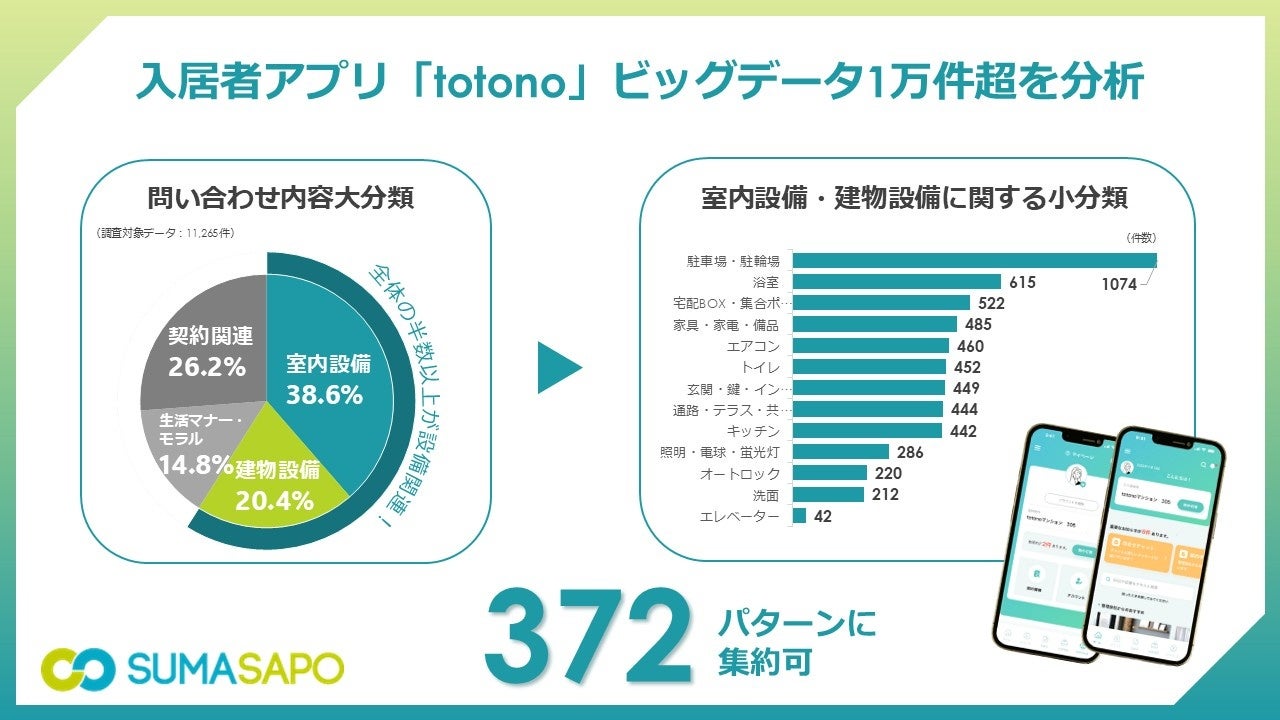 株式会社スマサポ(本社:東京都中央区、代表取締役社長CEO:小田 慎三、証券コード:9342、以下 スマサポ)は、不動産管理会社向けに提供している入居者アプリ「totono」に寄せられた入居者からの問い合わせ内容について、11,265件を対象とした分析結果を発表いたします。