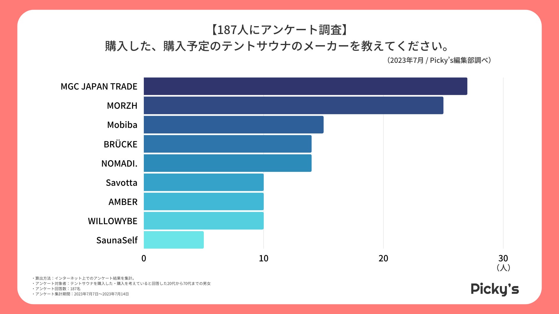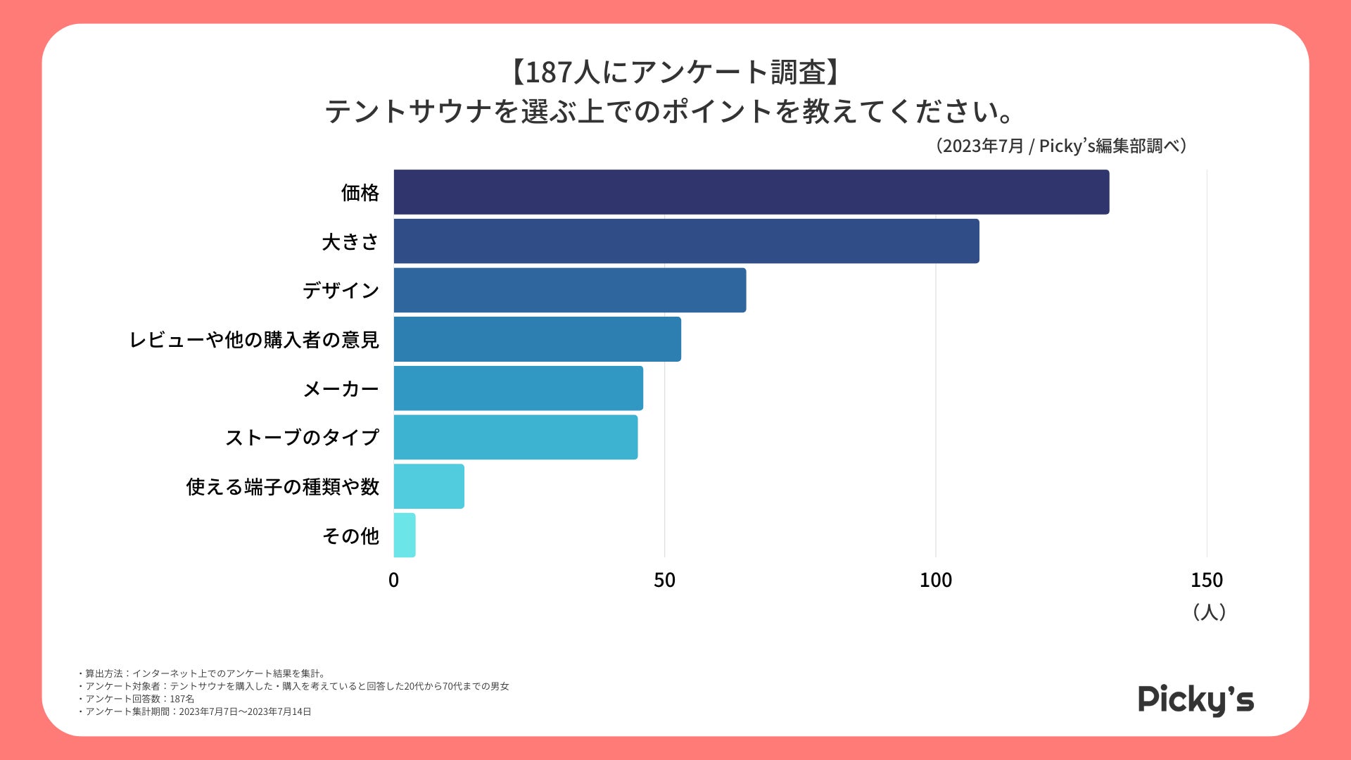 「Picky’s」は、インターネットショッピングにおいて、購入前に試せない・選ぶべきものがわからないという課題の解決を目標に、あらゆる商品のおすすめランキングや検証レビューを紹介するサイトです。このたびPicky’s(https://rentry.jp/note/)では、テントサウナについてインターネット上でアンケート調査を行いましたので発表いたします。