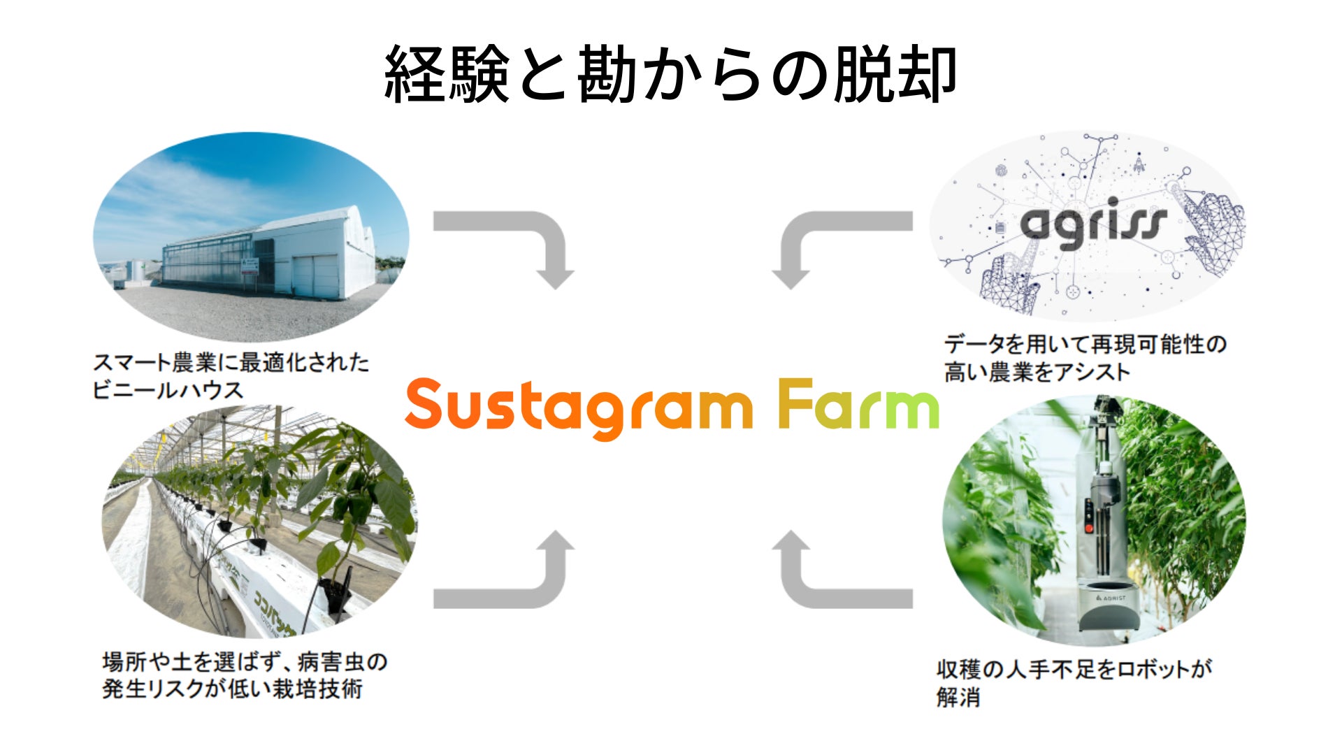 『Sustagram Farm』は「経験と勘からの脱却」を目的とし、ロボットとAIを活用し再現性高く稼げる農業を実現させるための、自動化農業システムパッケージです。