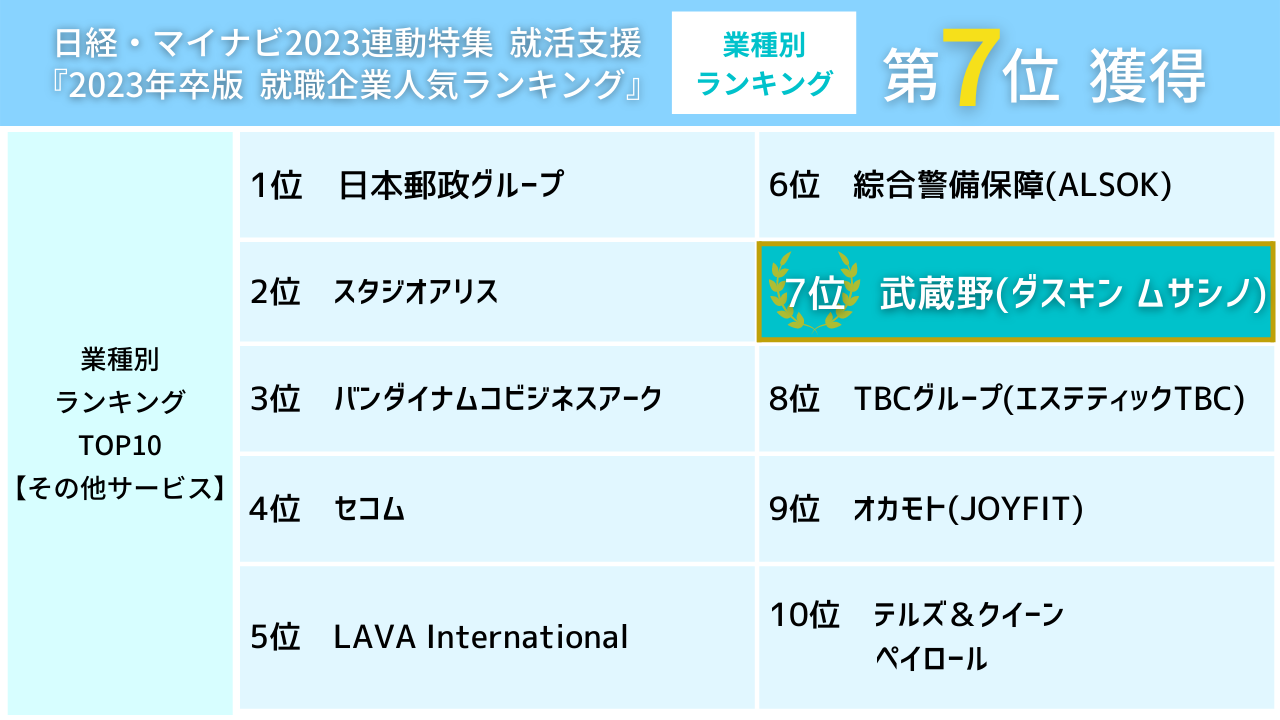 武蔵野は、日本経済新聞社と株式会社マイナビが発表した『2023年卒版就職企業人気ランキング』にて『業種別・その他サービス』の7位にランクインしました。