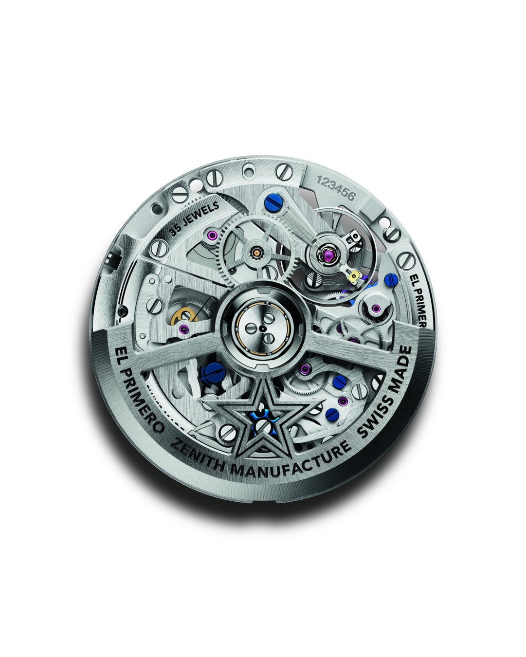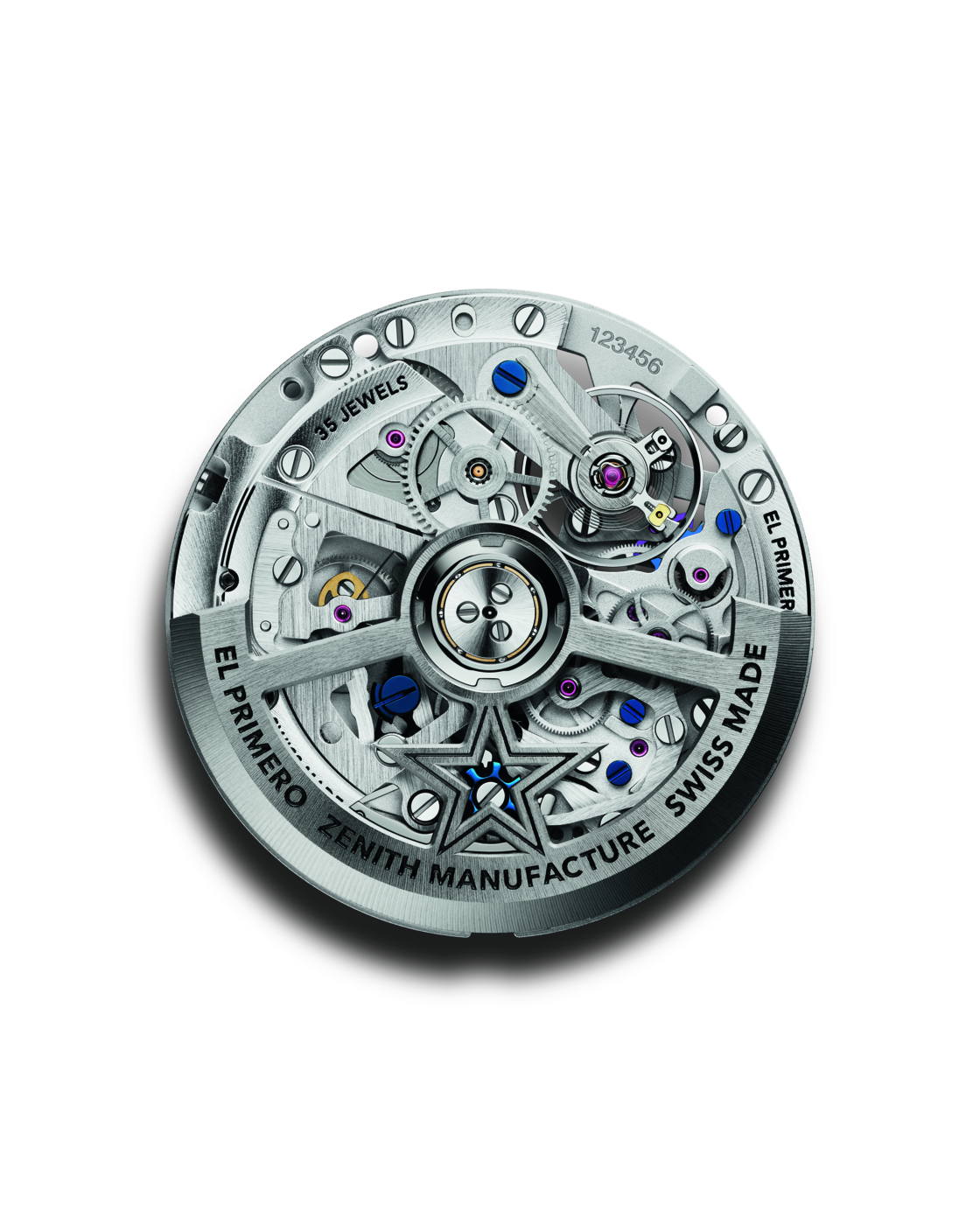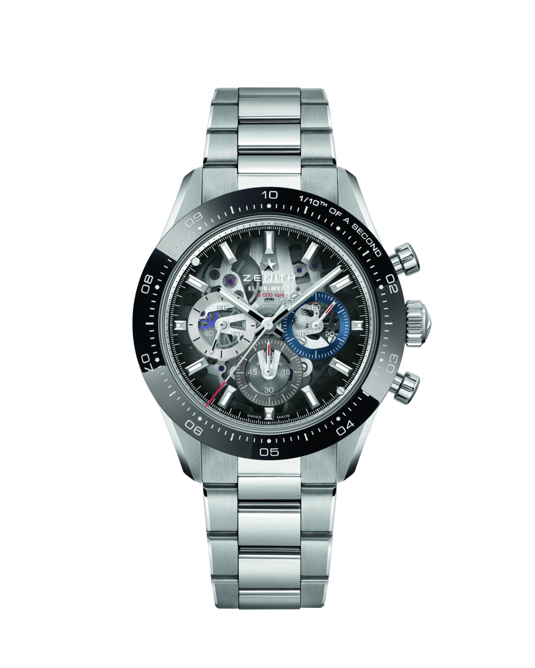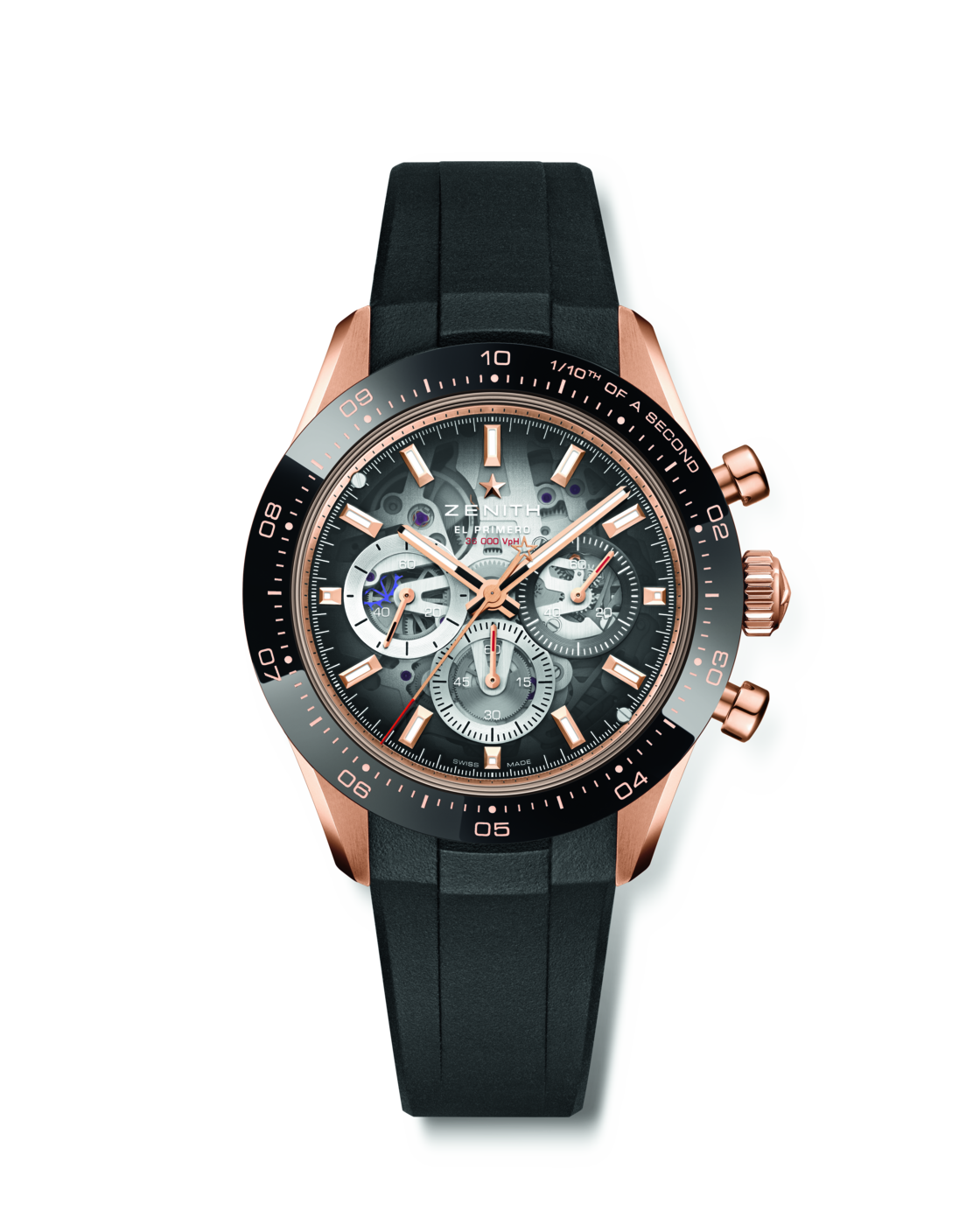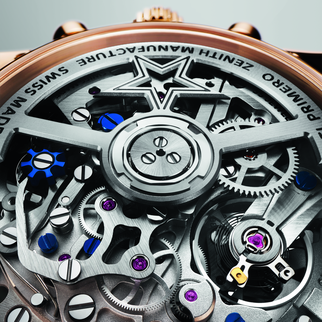 サファイアガラスの文字盤とケースバックからは、エル・プリメロ 3600 SKのブルーのコラムホイールと水平クラッチ構造を眺めることができます。ムーブメントは、精度と耐久性を高めるシリコン製ガンギ車、時刻を正確に合わせることのできる秒針停止機構を備え、高振動での動作にも関わらず約60時間のパワーリザーブを確保します。ゼニススターが刻まれたオープンワークのローターは、巻き上げ効率と機構のバランスを維持しながら、スケルトンの魅力を最大限に高めています。