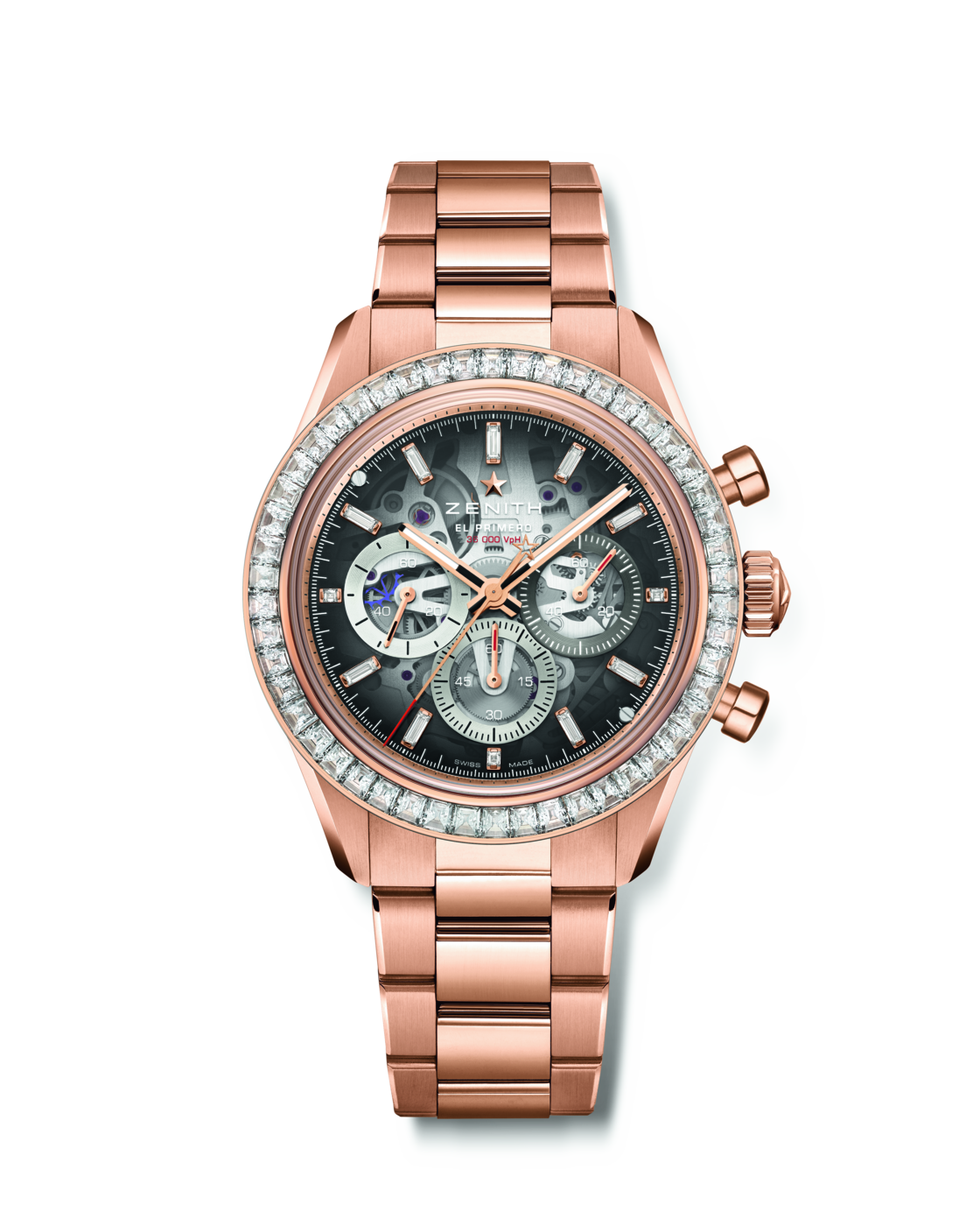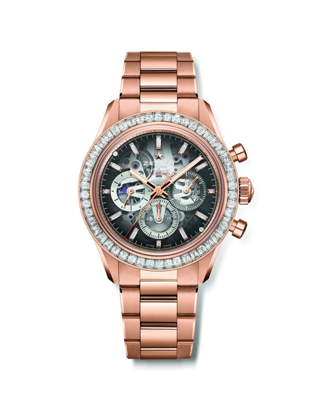 22.3130.3600/01.M3100 / エル・プリメロ 3600 SK 自動巻 / パワーリザーブ 約60時間 / 18Kローズゴールド / ケース径 41 mm / バゲットカットダイヤモンド 52ピース(VVS)約5カラット /カラーサファイア文字盤 / 3色カンター / 10気圧防水 / 14,927,000円(税込予価)/ 限定10本