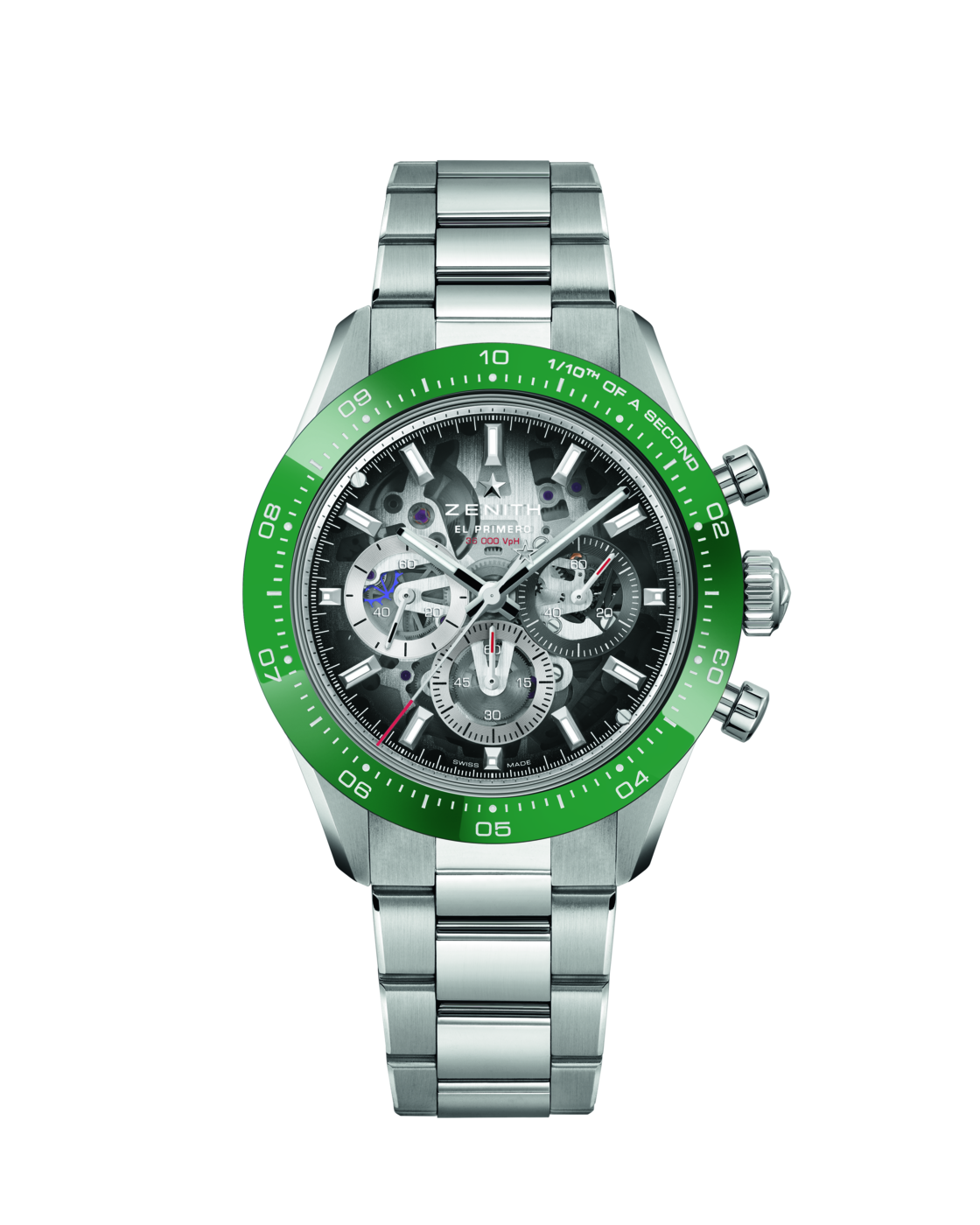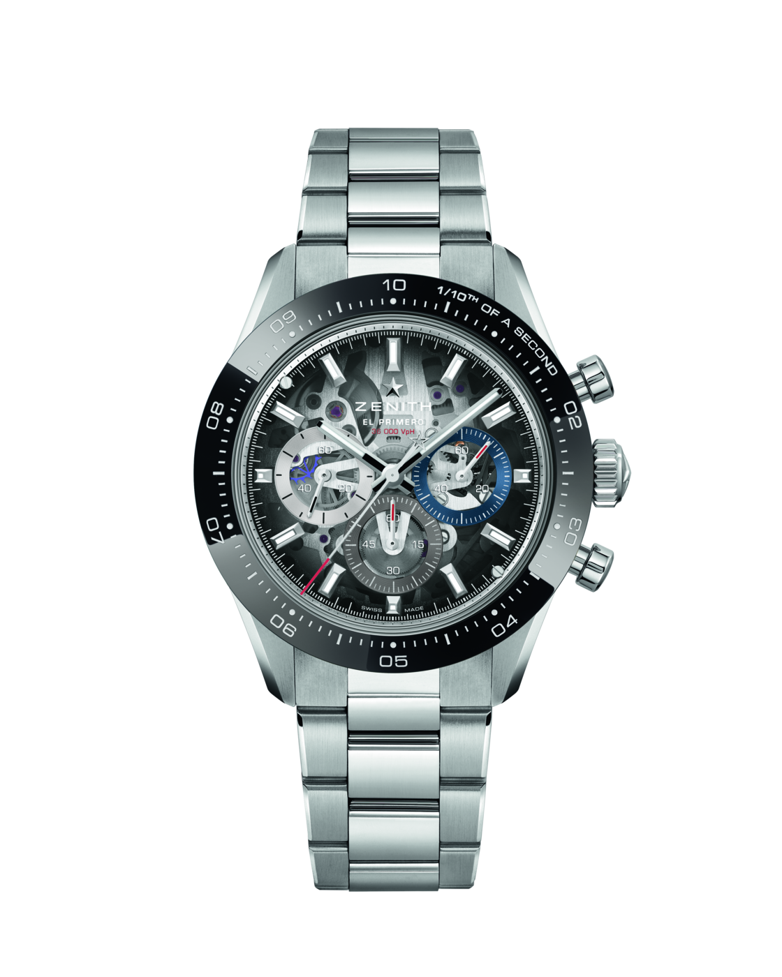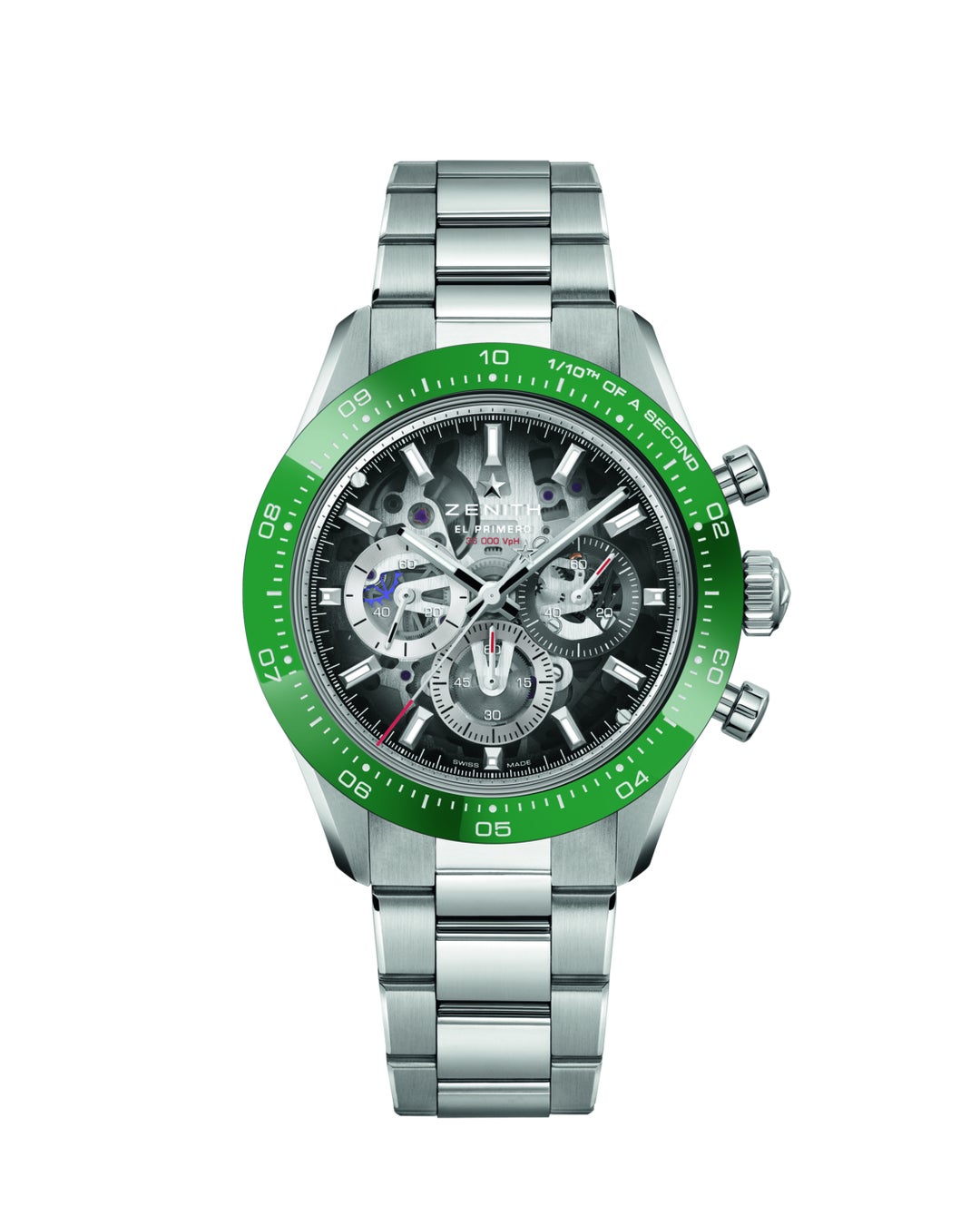 今日、その系譜に名を連ねる「クロノマスター スポーツ」は、5Hzで制御されるエル・プリメロ 3600を搭載し、高振動により1/10秒を精確に計測することが可能です。この性能は、エル・プリメロのアーキテクチャが直接的にもたらすものです。従来のクロノグラフではセンターのクロノグラフ秒針が1分で1回転するのに対し、エル・プリメロ 3600では10秒で1回転します。秒針の1ステップが1/10秒に対応し、目盛りの付いたセラミックベゼル上でそれを直接指し示すことで、高振動がなせる性能の計測と表示を実現しています。ゼニスのクロノグラフは半世紀以上にわたり、このテクニカルなアプローチを守り続けてきました。