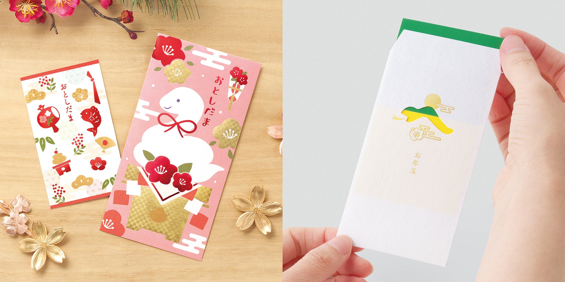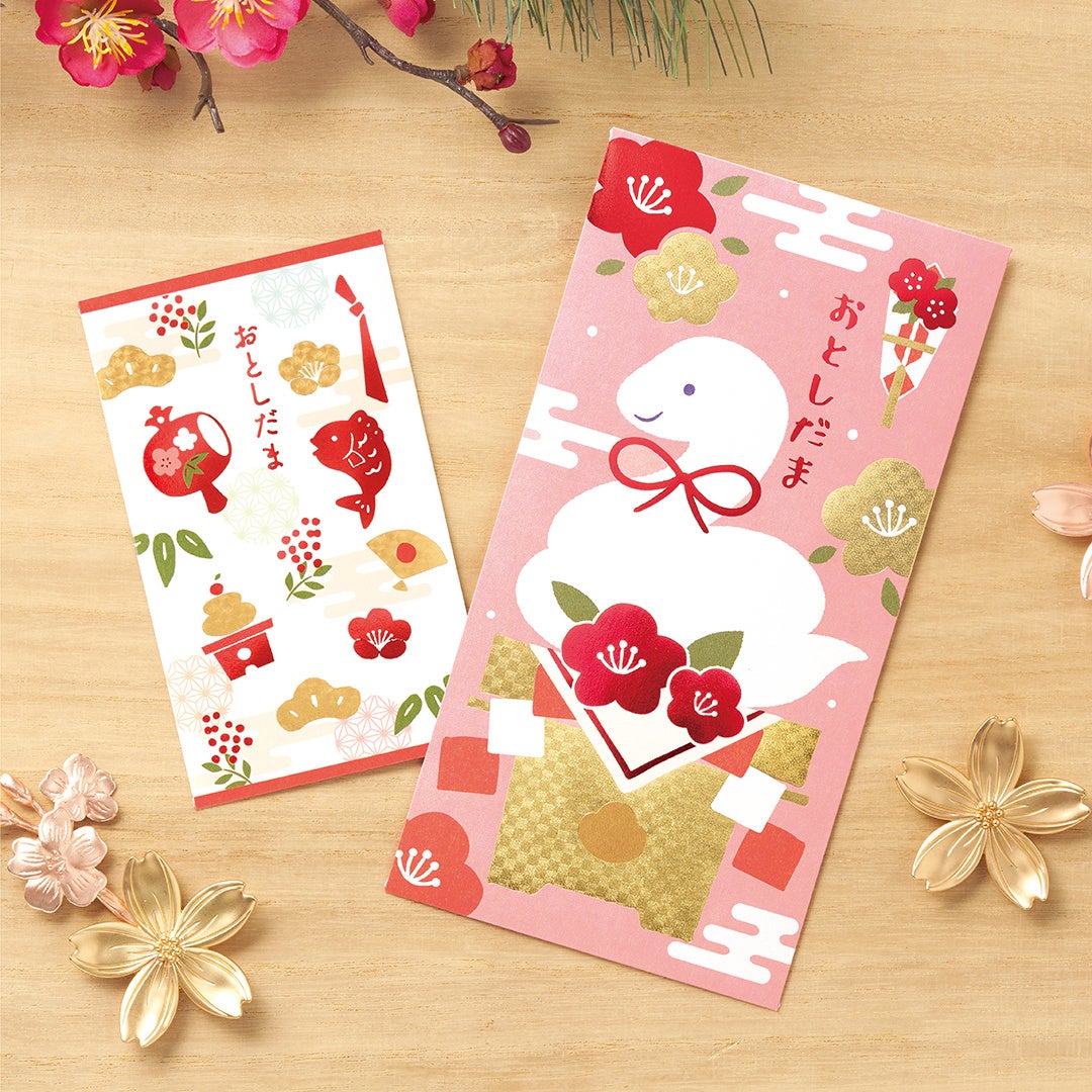 製品名:金箔お年玉 ぽち袋/価格:330円(税込)/種類:2種(干支、和風)/内容:3枚入/製品寸法:65×110mm/https://stg-paper.maruai.co.jp/shop/c/c03059895