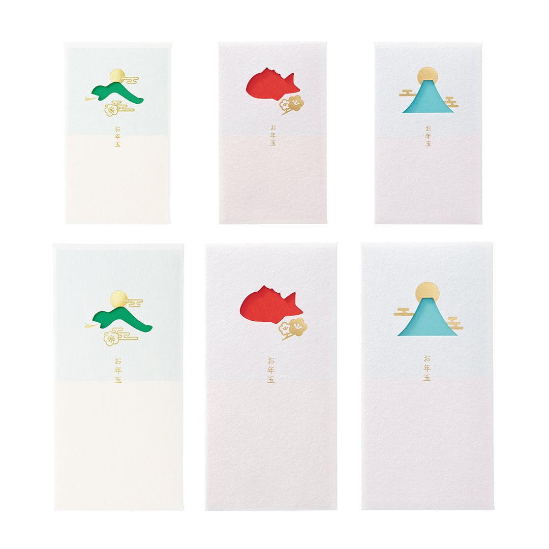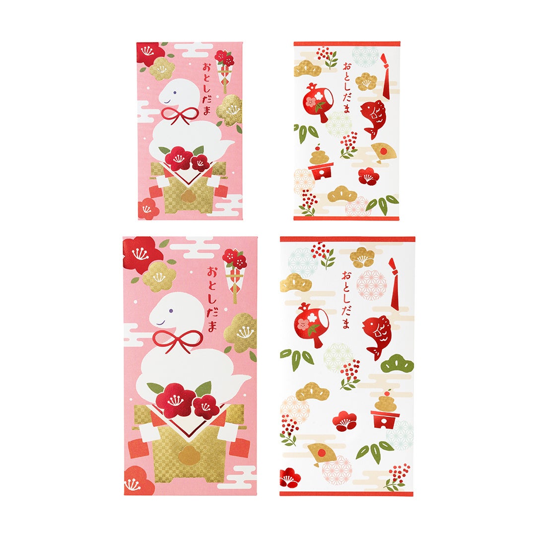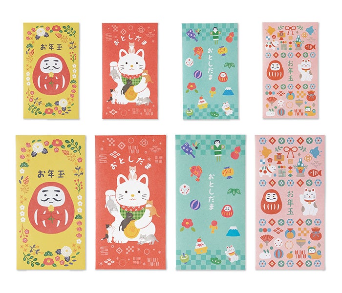 製品名:お年玉 縁起物柄/価格:132円(税込)/種類:4種/内容:5枚入/製品寸法:70×120mm/https://stg-paper.maruai.co.jp/shop/g/g4902850418744
