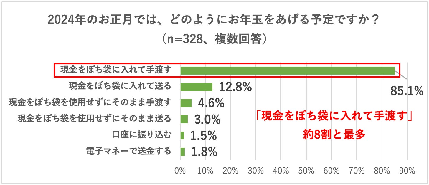 近年はバーコード決済や電子マネーなどオンライン上での決済や送金が普及する一方で、マルアイが2023年11月に実施した「2024年お年玉に関する実態調査」では、約8割の人がお年玉をぽち袋に入れて手渡すと回答しました(※1)。実際に当社の2024年度『お年玉袋』の売上は、コロナ流行前の2019年と比較して98%と回復傾向にありました(※2)。このことから、2025年度のお正月はより一層お年玉を直接会って手渡す動きが増加すると考えられます。
