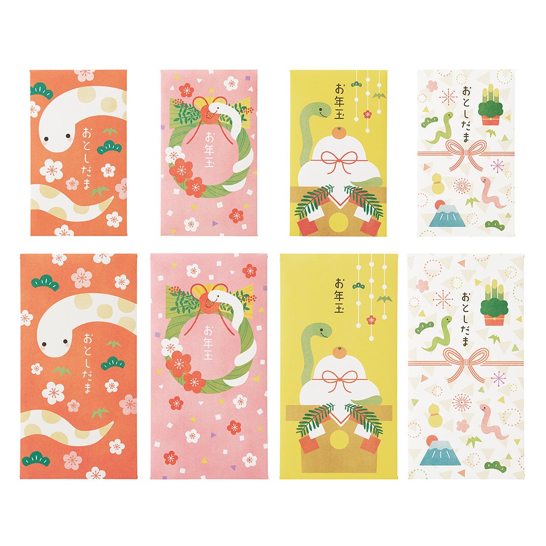 2025年の干支である「巳」をモチーフにした新作12種が2025年度限定品として登場します。また、2024年度で好評だったディズニーやミッフィー、縁起物が描かれたデザインの販売も開始し、2025年度は全8シリーズ・46種のお年玉袋を展開します。