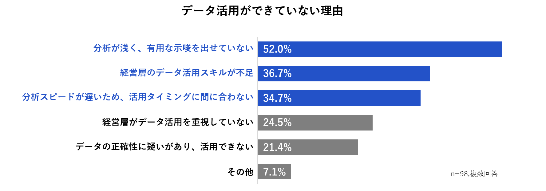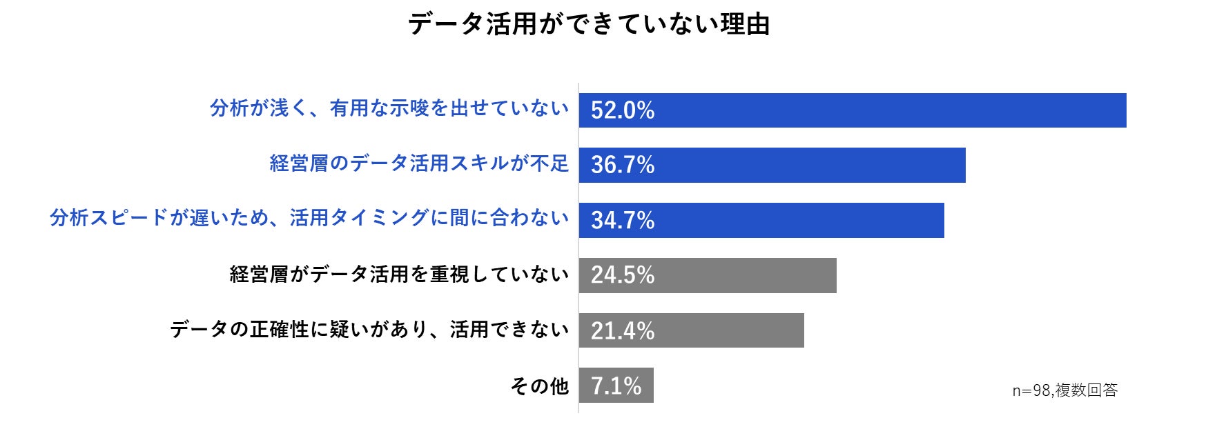 次に、データ活用ができていない理由をたずねたところ、第1位は「分析が浅く、有用な示唆を出せていない(52.0%)」、第2位は「経営層のデータ活用スキルが不足(36.7%)」、第3位は「分析スピードが遅いため、活用タイミングに間に合わない(34.7%)」という結果となり、多くの企業がデータ分析に課題を抱えていることが分かりました。