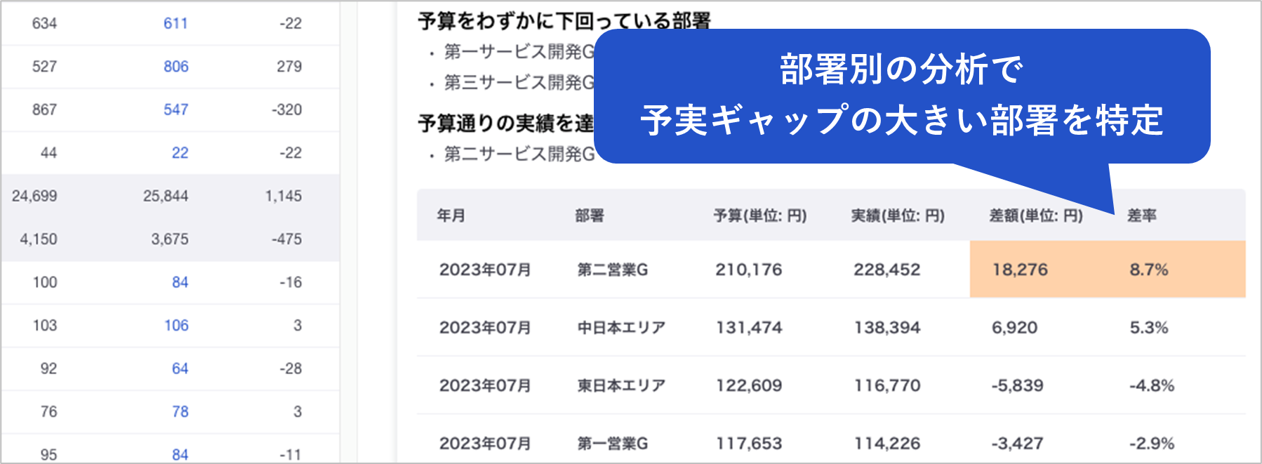 ・複数のデータ分析軸を切り替えながら予実ギャップやその要因を特定するのに費やしていた時間が、大幅に短縮