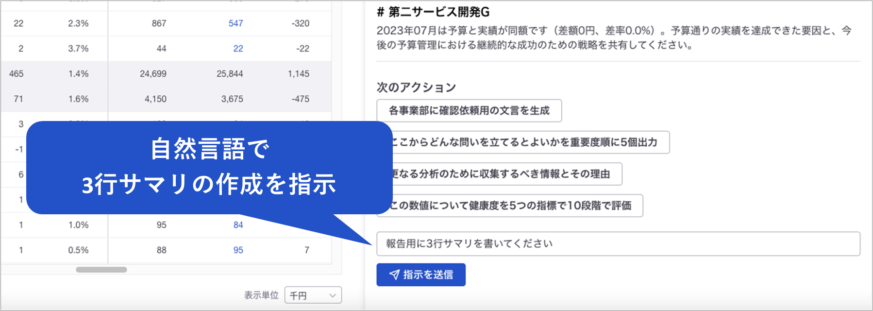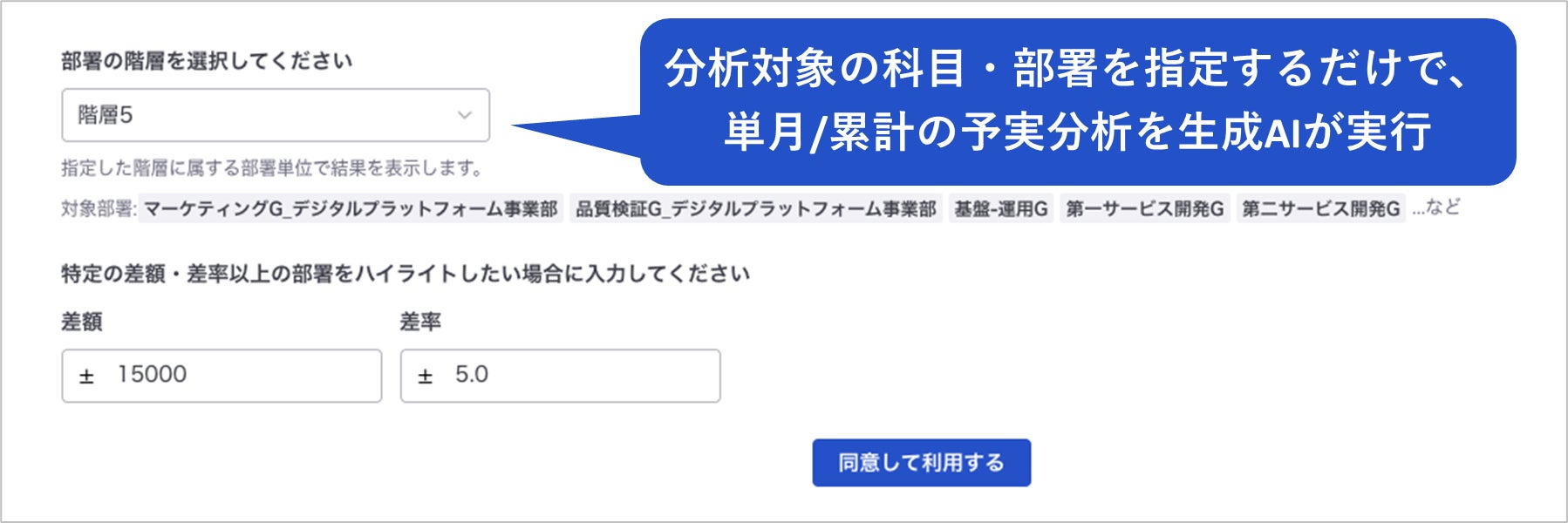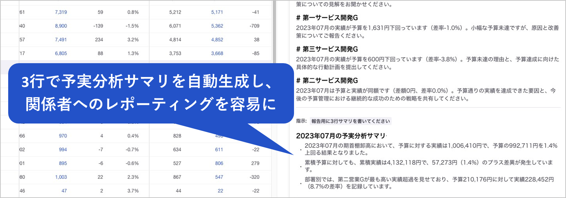 ① 分析対象の科目・部署を指定するだけで、単月/累計の予実分析を生成AIが実行し、ギャップを可視化。毎月の予実分析が、効率良くスピーディーに実施可能に