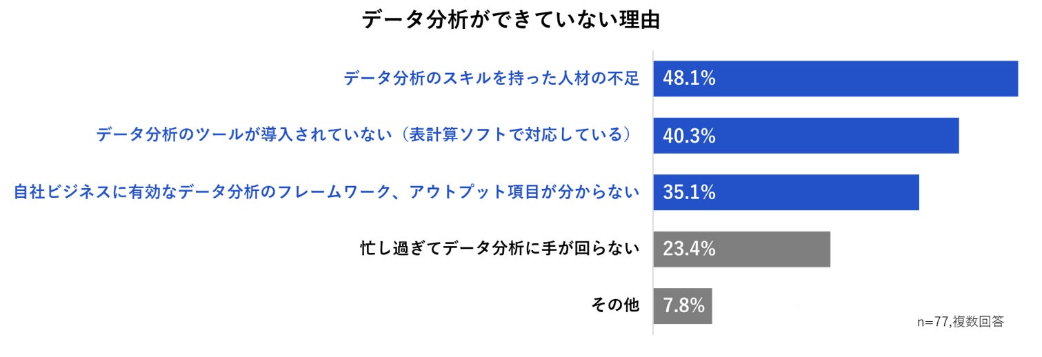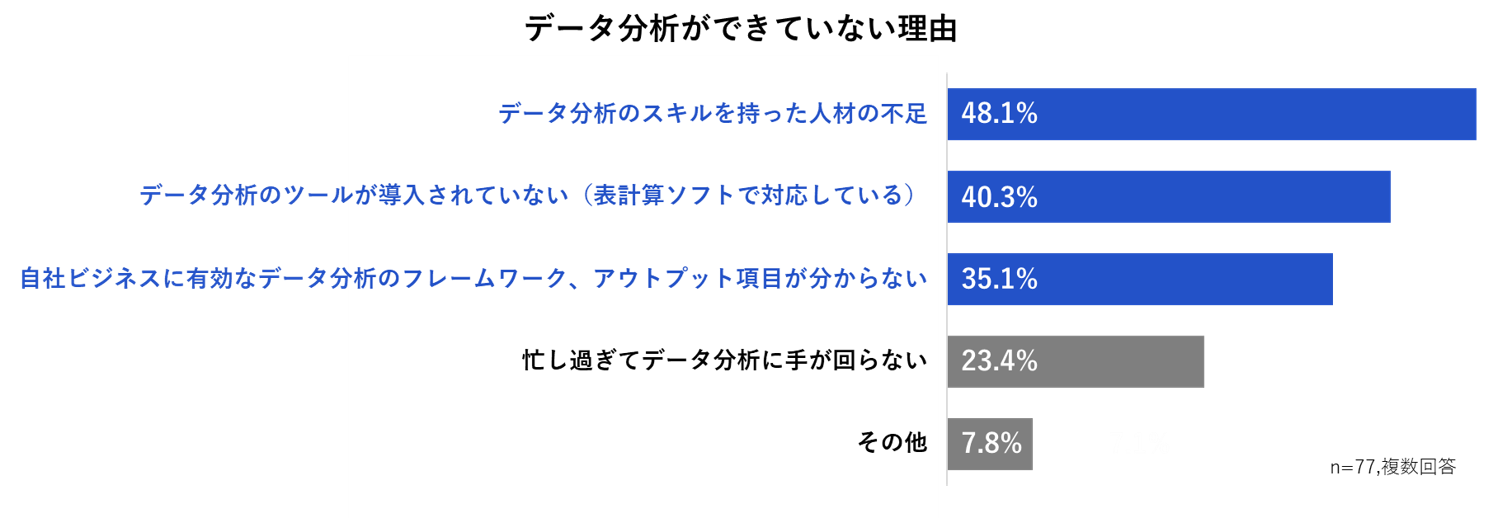 データ分析ができていない理由をたずねた設問では、第1位は「データ分析のスキルを持った人材の不足(48.1%)」、第2位は「データ分析のツールが導入されていない(表計算ソフトで対応している)(40.3%)」、第3位は「自社ビジネスに有効なデータ分析のフレームワーク、アウトプット項目が分からない(35.1%)」という結果となり、データ分析スキルをもった人材の不足や、データ分析ツールの導入の遅れが課題であることが分かりました。