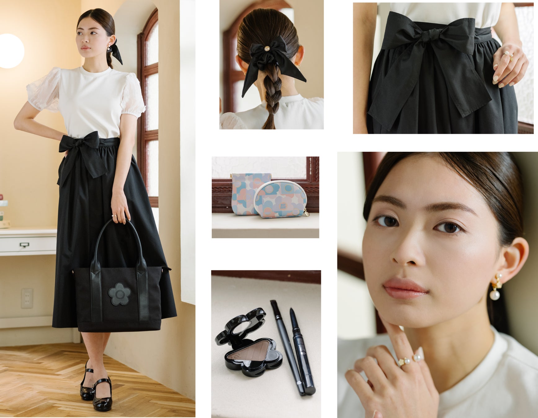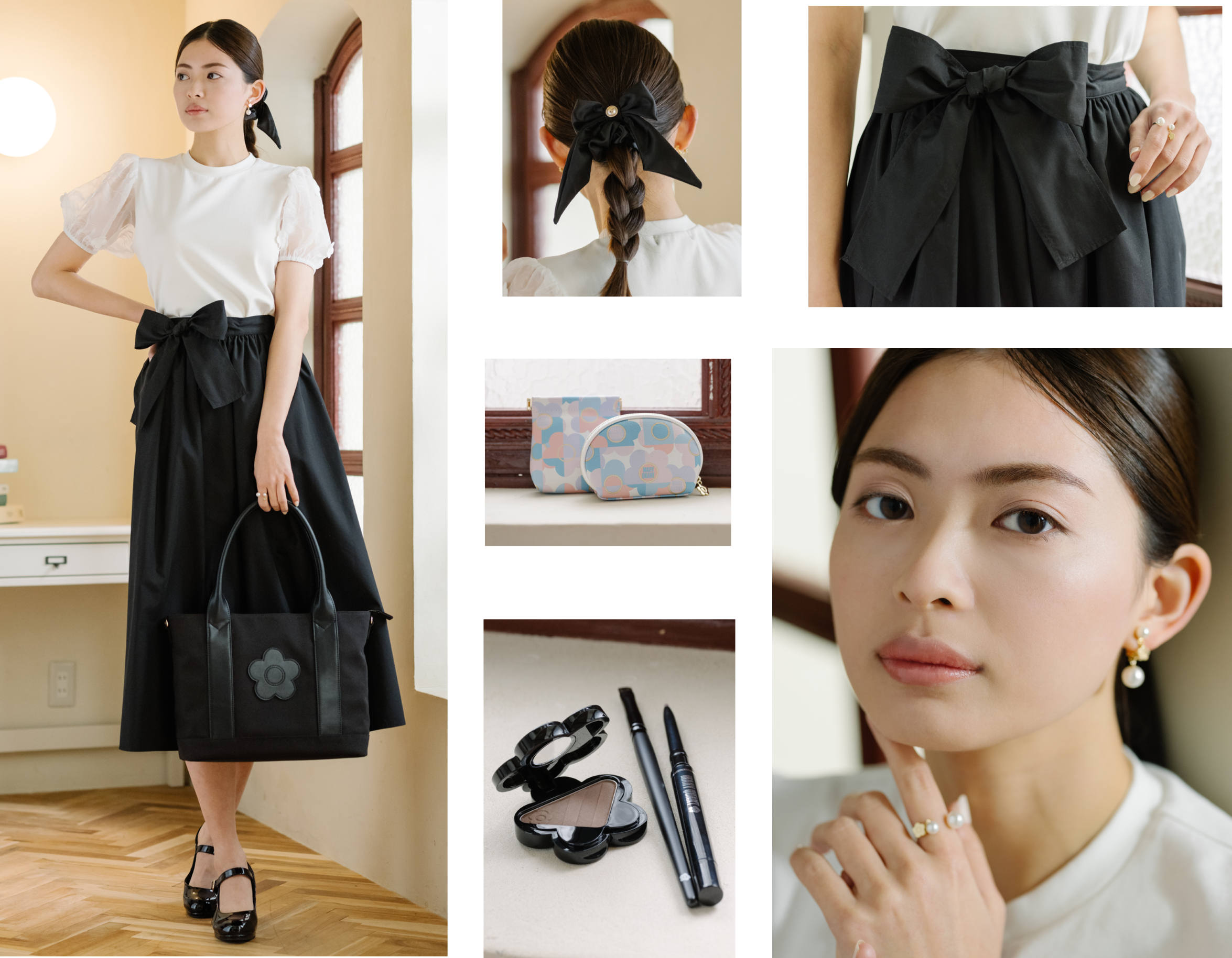 ブロッキングデイジーバネクチ ポーチ(ホワイト) ¥3,520(本体価格¥3,200) スクエアデイジーパッチ2WAY トート(ブラック) ¥15,400(本体価格¥14,000) オーナメントパールサテン シュシュ(ブラック) ¥3,850(本体価格¥3,500) メタルポイントパール イヤリング(ホワイト)¥3,300(本体価格¥3,000)