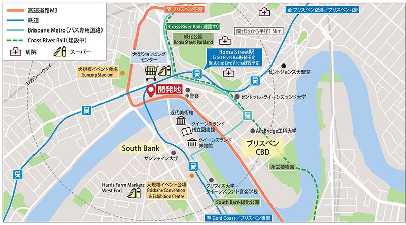 開発地は豪州で3番目の経済規模を誇るクイーンズランド州ブリスベンに位置し、雇用集積地であるCBD(ビジネス中心地)まで約1.5㎞のエリアです。2025年に開通予定のCross River Rail(新地下鉄ライン)の接続が予定されているRoma Street駅まで徒歩約10分、ブリスベン空港までも車で約20分という交通面の利便性に優れた立地です。周辺には、2032年ブリスベンオリンピックのメイン競技会場の一つとなる予定のBrisbane Live Arenaが建設予定であるほか、ブリスベン川を隔てたSouth Bankエリアには大学等の教育機関や州立博物館等の美術館・アミューズメント施設が多数点在するなど、生活面での高い利便性も兼ね備えた好立地が特徴です。