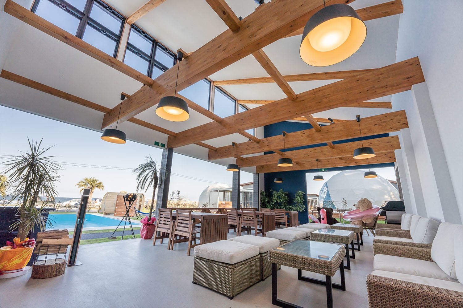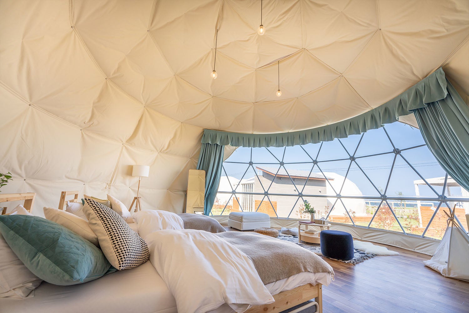 客室は直径6mの半円形大型ドームテントを採用。オールシーズン快適に過ごせるようエアコンを備えた広々としたテント内には、こだわりのインテリアを配置。全10棟、うち4棟は愛犬同伴可能なプライベートドッグラン付きです。