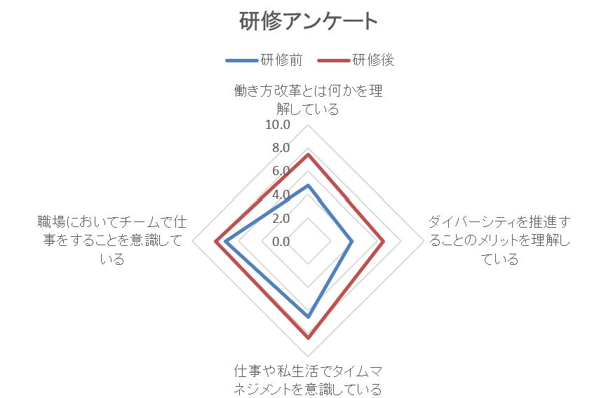 実施前後の対象職員向けアンケート(10段階評価)では、「ダイバーシティの推進に対する理解」が4.8ポイントから7.4ポイント(1.7倍)へ、「働き方改革への理解」が3.8ポイントから6.5ポイント(1.6倍)へそれぞれ向上するなどの変化が生まれています。