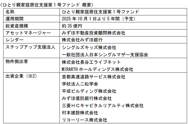 本ファンドは、不動産私募ファンドのスキームを用いて、ひとり親家庭の居住支援および自立支援(ステップアップサポート)を実施する取り組みであり、