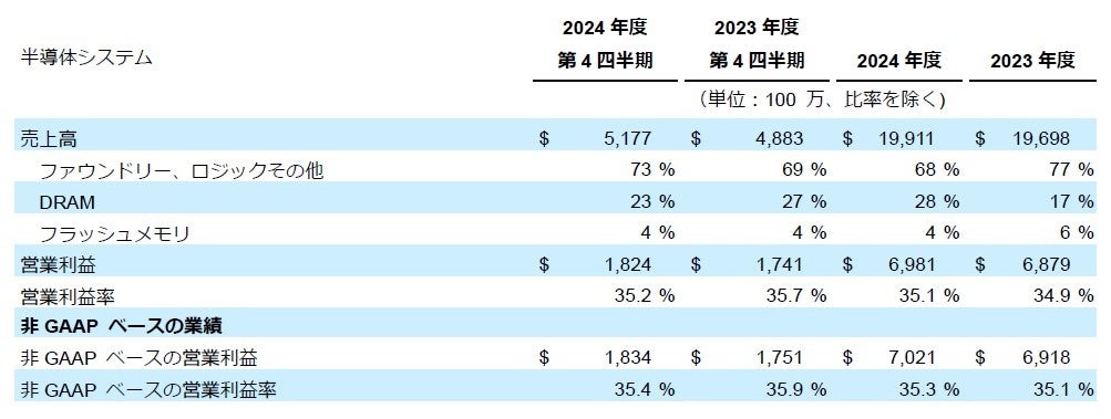 アプライド マテリアルズ(Applied Materials, Inc., Nasdaq:AMAT、本社:米国カリフォルニア州サンタクララ、社長兼CEOゲイリー・E・ディッカーソン)は11月14日(現地時間)、2024年度第4四半期および通年(期末:2024年10月27日)の決算を発表しました。