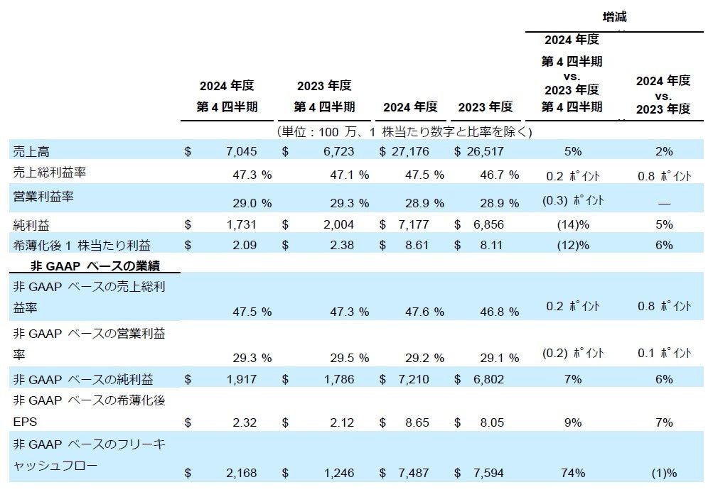 2024年度の売上高は過去最高の271億8,000万ドルでした。GAAPベースでは、売上総利益率が過去最高の47.5%、営業利益は過去最高の78億7,000万ドル(売上高の28.9%)、1株当たり利益は過去最高の8.61ドルでした。