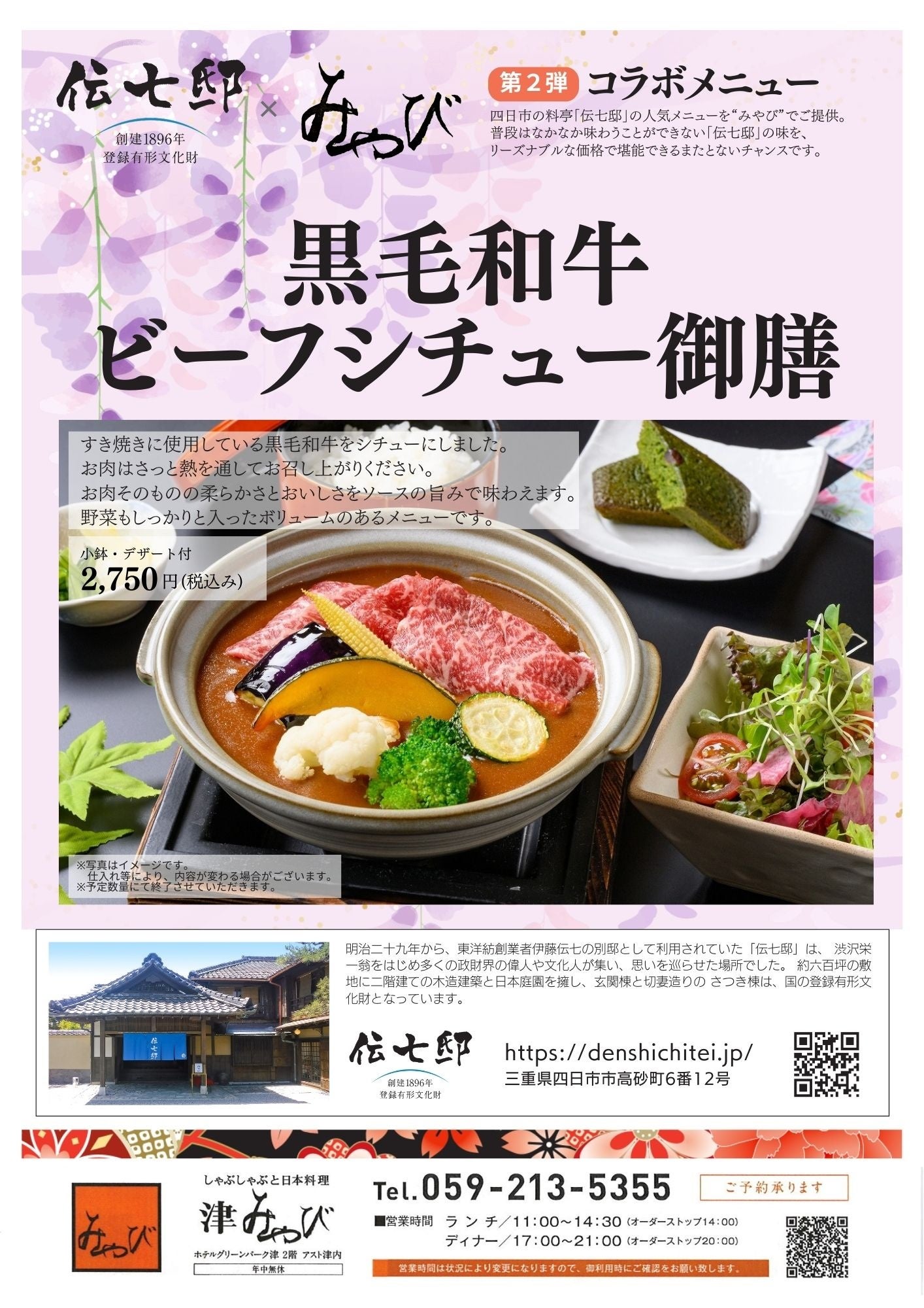 本企画は、明治時代から続く四日市の歴史的建造物「伝七邸」の味と文化の魅力を、より多くの方に伝えることで、地域活性化につなげることを目的としています。2025年1月に実施した第一弾「黒毛和牛ロース炙り焼き肉重膳」が多くのお客様にご好評をいただいたことを受け、今回は「黒毛和牛ビーフシチュー御膳」をお届けします。