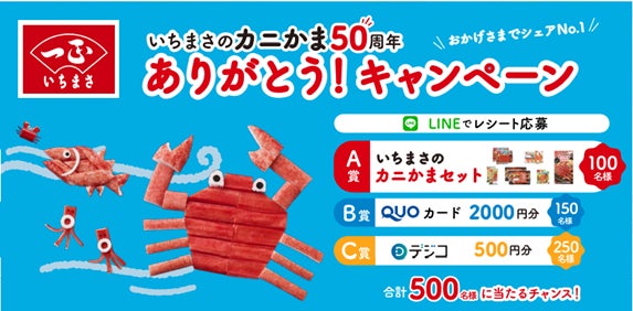 本キャンペーンは、50年の感謝の気持ちを込めて、QUOカード2000円分や、限定カニかまグッズなどのバラエティ感あふれる賞品が合計505名さまに当たります。いちまさのカニかま体験が堪能できる2つのキャンペーンをお見逃しなく、ご応募ください!