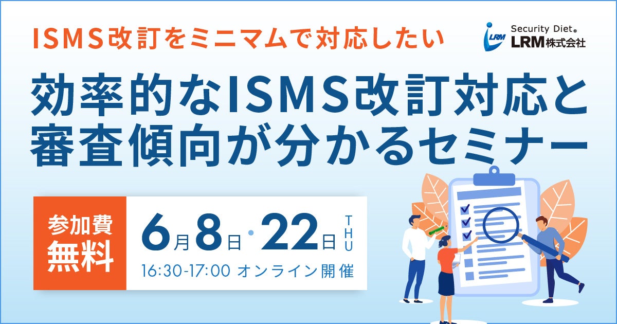 ISMS認証取得支援をはじめとするコンサルティング実績2,300社以上のLRM株式会社が、「ISMS改訂にミニマムで対応したい」「はじめてのISMS改訂を確実に対応したい」という方向けに、ISMS改訂における基礎知識から、無駄な工数をかけずに効率的に対応するための要点を分かりやすく解説いたします。また、その場で皆様のご質問にもお答えしますので、ぜひお気軽にご参加ください。