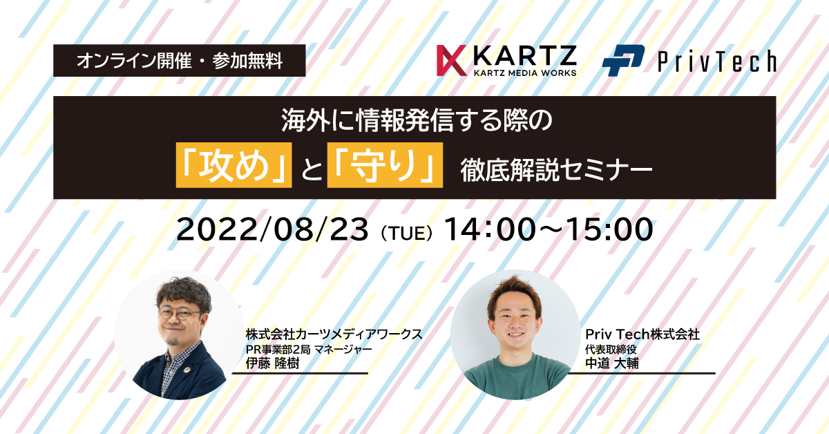 Priv Tech株式会社(本社:東京都新宿区、代表取締役:中道 大輔、以下Priv Tech)と株式会社カーツメディアワークス(本社:東京都渋谷区、代表取締役:村上 崇、以下カーツメディアワークス)は共同で、無料オンラインセミナー『海外に情報発信する際の「攻め」と「守り」徹底解説セミナー』を2022年8月23日(火)14時より開催いたします。
