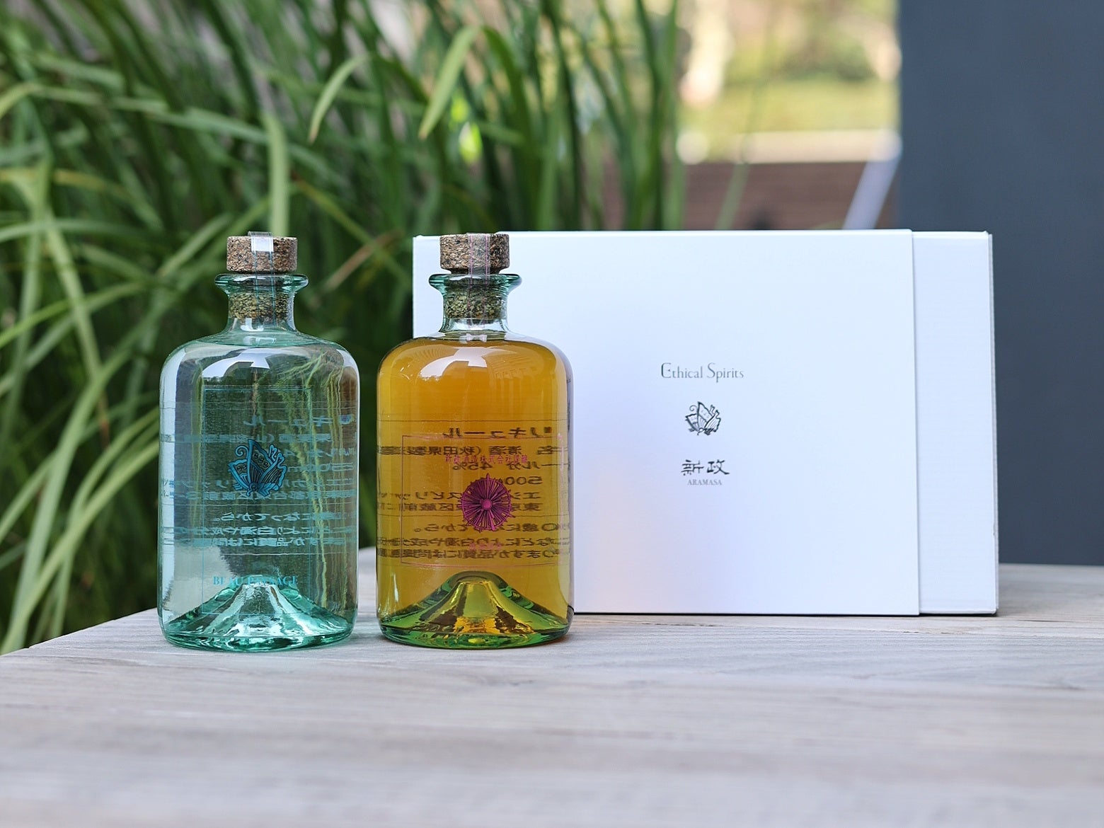 蒸留酒は、それぞれ『BEAU PAYSAGE Eau de vie de vin』『新政 Spirit Of Cosmos』と名付けられ、エシカル・スピリッツを含めた3社の水への思いを込めたセットとして完成しました。