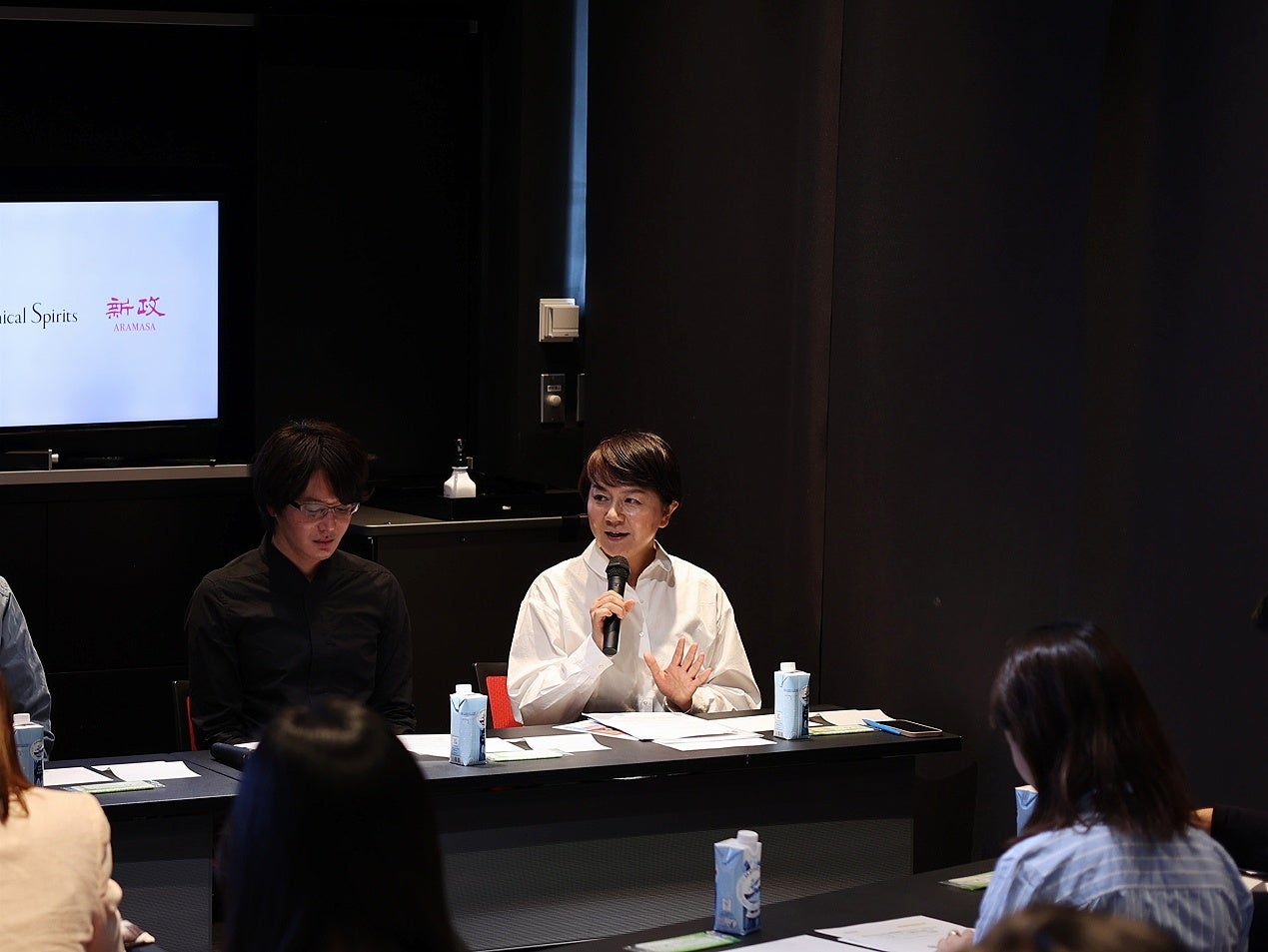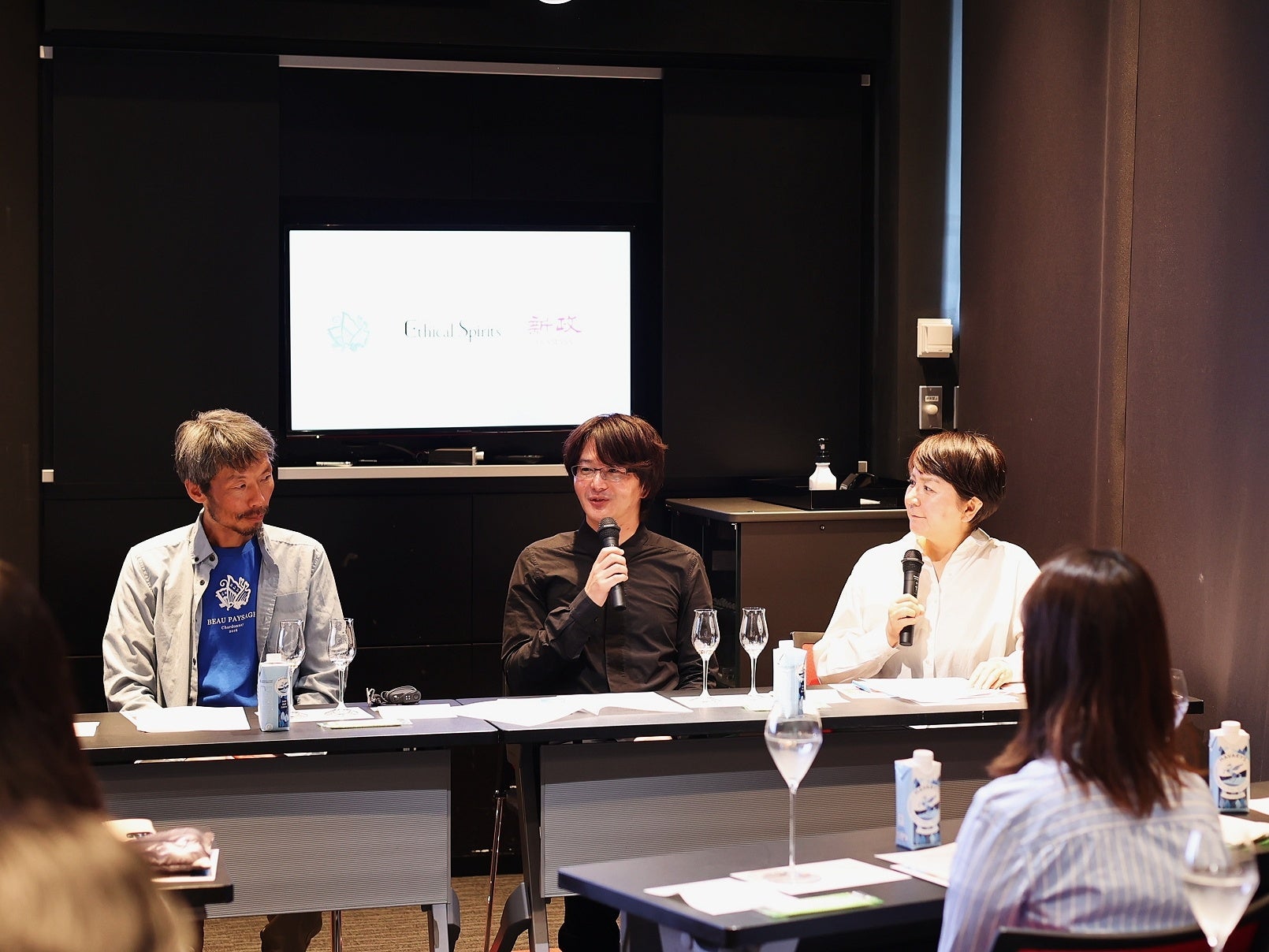 お披露目会では、さまざまな業界からゲストをお招きし、今回登壇したBEAU PAYSAGE オーナー 岡本英史氏、新政酒造 8代目蔵元 佐藤祐輔氏、エシカル・スピリッツ 最高蒸留責任者 山口歩夢より、今回蒸留した蒸留酒の紹介とパネルディスカッションを行いました。