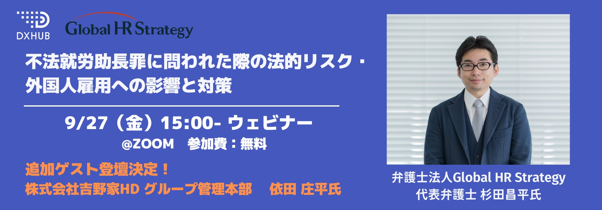 【9/27開催】不法就労助長罪に問われた際の法的リスク・外国人雇用への影響及び対策についてのウェビナーに株式会社吉野家ホールディングス グループ管理本部の依田様が追加登壇ゲストに決定いたしました。