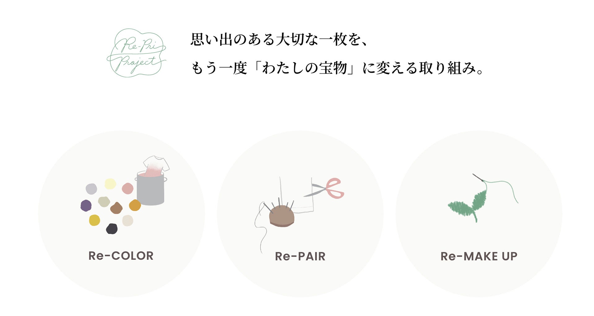 リプリプロジェクトは2012年にスタートした、『思い出のある大切な一枚を、もう一度「わたしの宝物」に変える』、プリスティンの考えるアップサイクルの取り組みです。使わなくなってしまった製品の Re-COLOR(染め直し)、Re-PAIR(お直し)、Re-MAKE UP(クリエイティブダーニング刺繍、クリエイティブリメイク)をご用意しています。