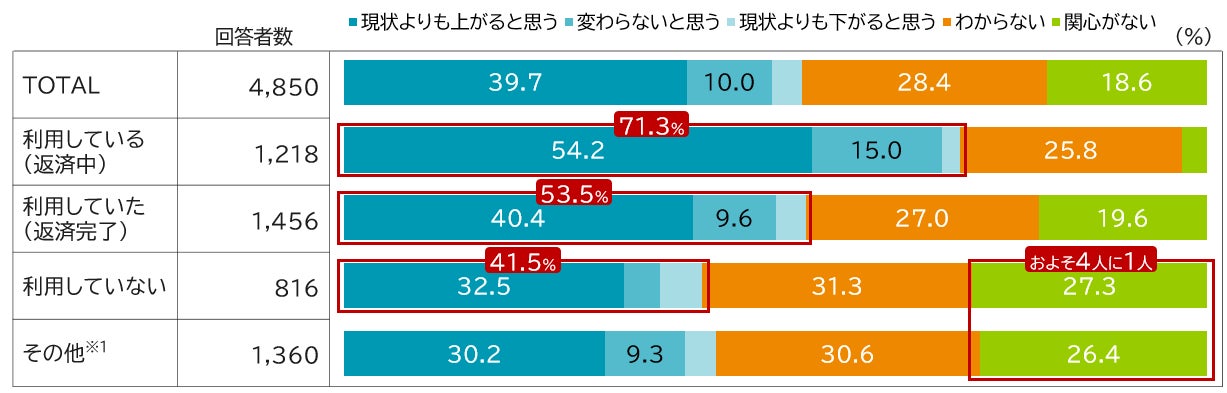 すると、持ち家にお住まいの方のなかでも、住宅ローンを利用している(現在、住宅ローンの返済中の)方は、71.3%が「住宅ローン金利の動向に対し何らかの見解あり」と圧倒的に多くなっていました。反対に、持ち家にお住まいの方であっても、「住宅ローンを利用していない方」や「相続・譲渡などで現在の持ち家を保有した方」では、およそ4人に1人は「関心がない」を選択されていました。
