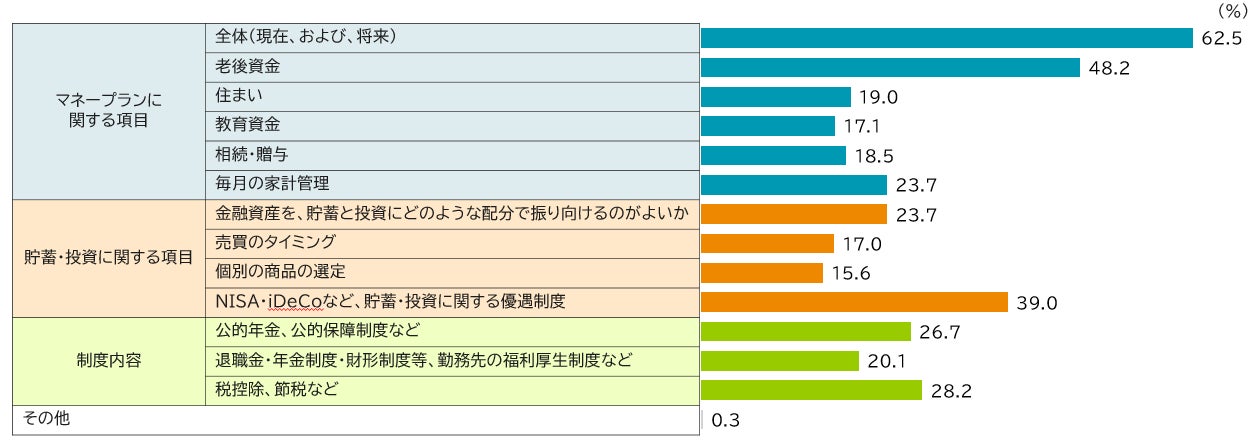 最も多かったのは、「マネープラン全体(現在、および、将来)」で62.5%、次いで「マネープランの中の老後資金」が48.2%「NISA・iDeCoなど、貯蓄・投資に関する優遇制度」が39.0%という結果でした。