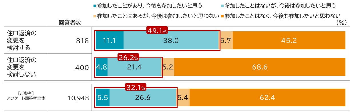 またすぐにアクションを起こすのではなく、まずは「金利上昇によって返済にどの程度の差が出るか自分で確認する」(20.1%)、「借入金融機関へ返済計画見直しの相談する」(19.9%)が選択されているのは、金利上昇が与える影響をまずは知りたいという自然な気持ちの表れかと思われます。